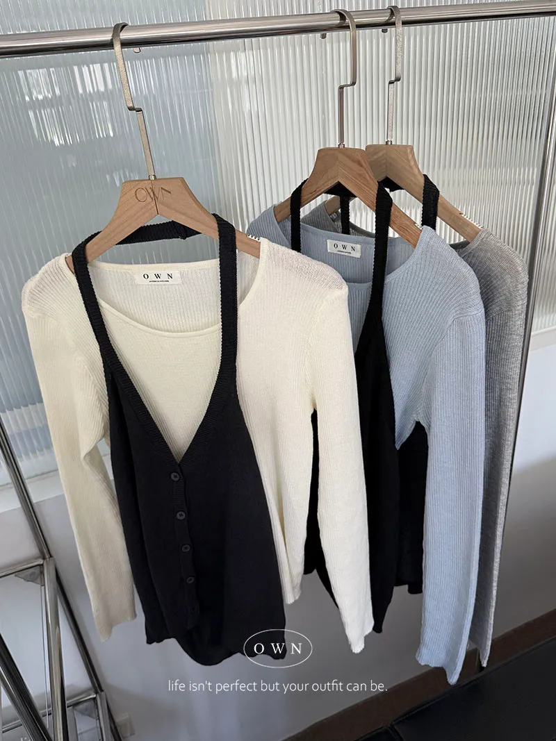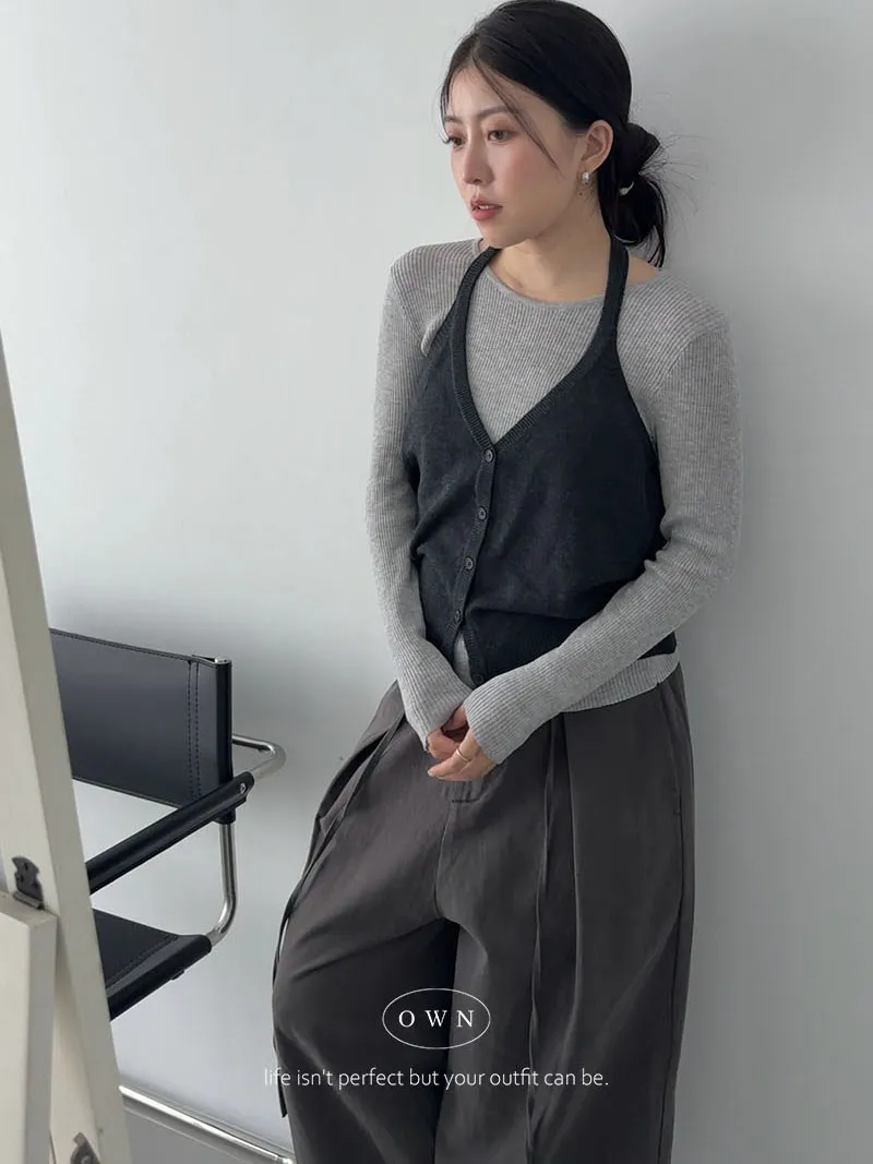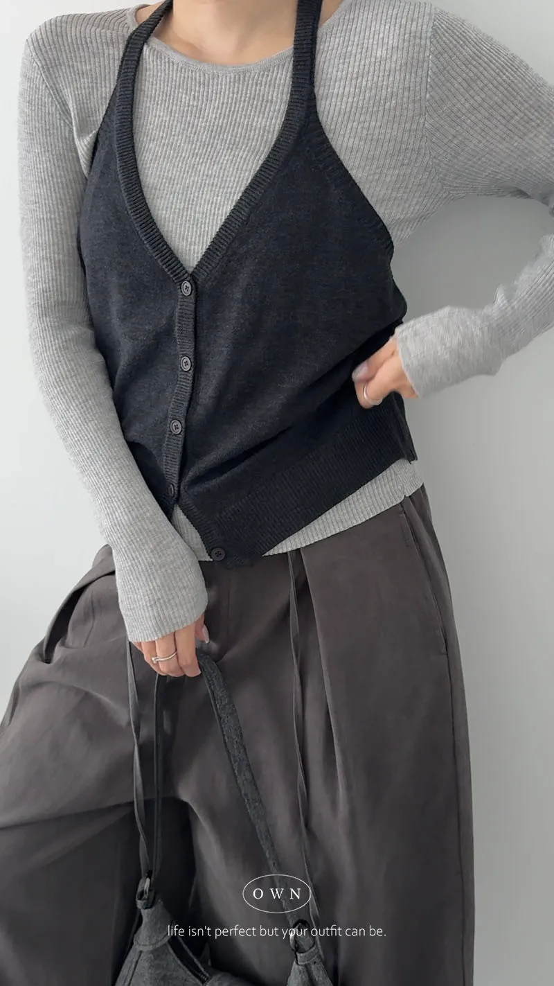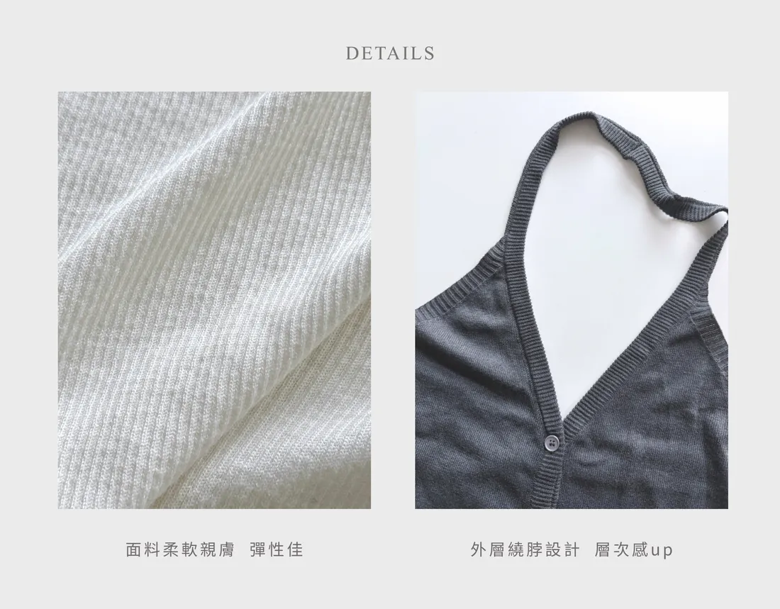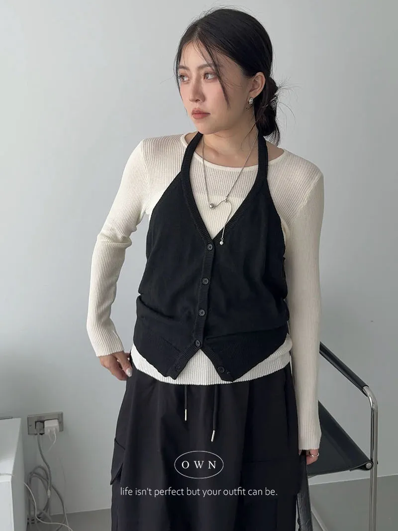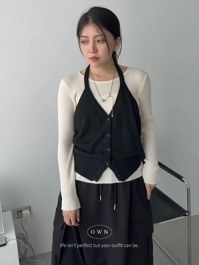 一生都愛這種慵懶感 兩件式針織長袖上衣+針織開釦繞脖背心 3colors