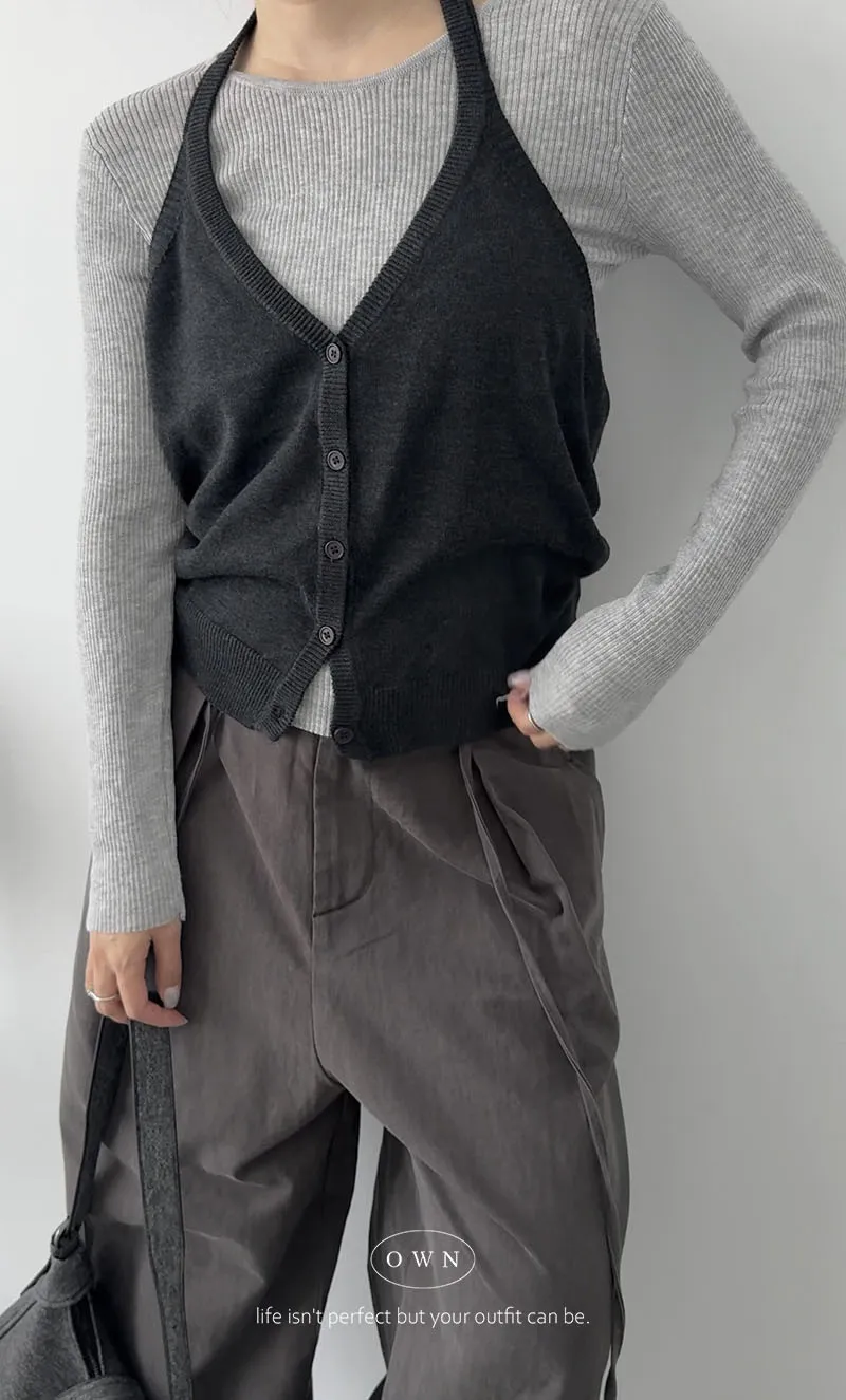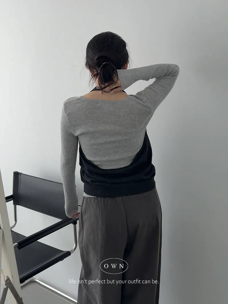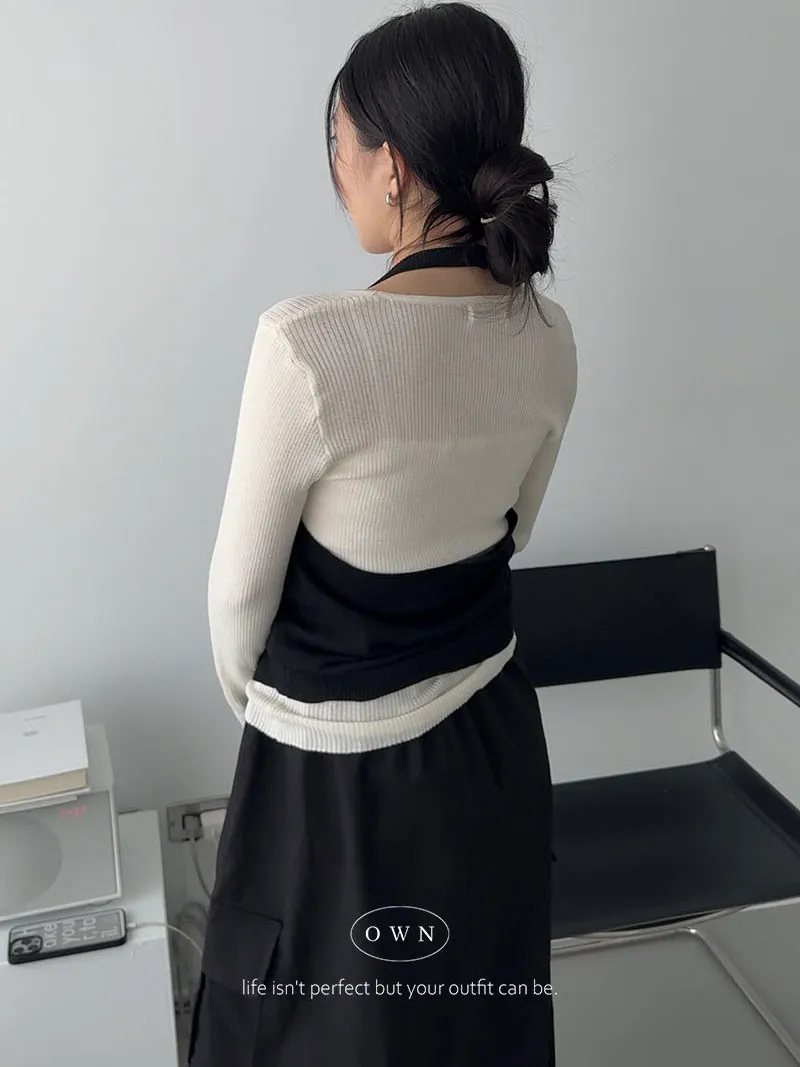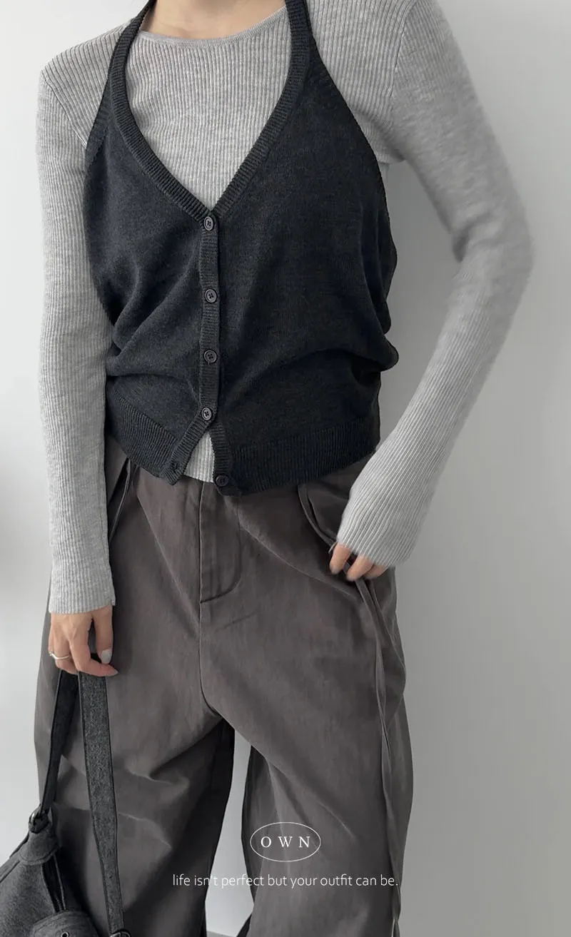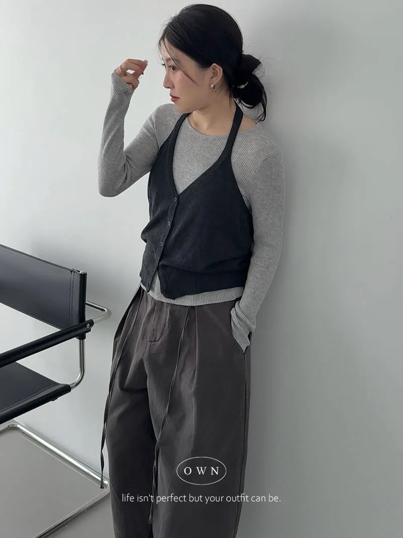 一生都愛這種慵懶感 兩件式針織長袖上衣+針織開釦繞脖背心 3colors