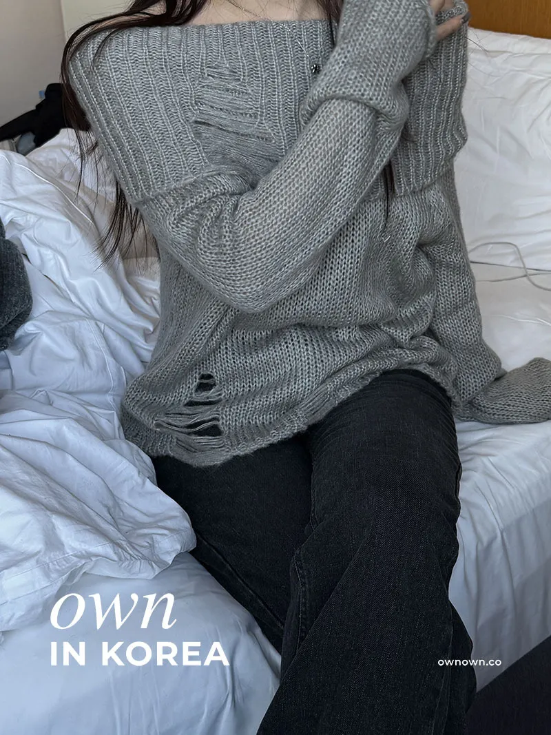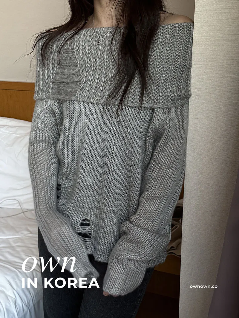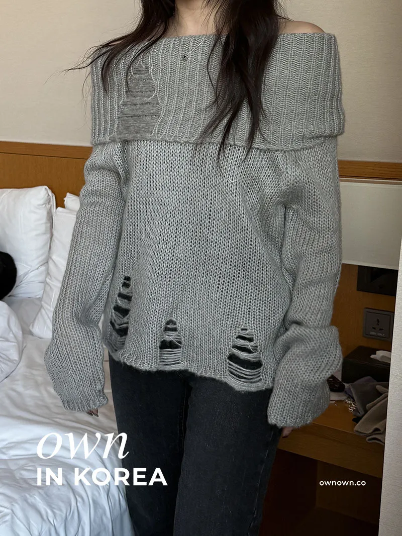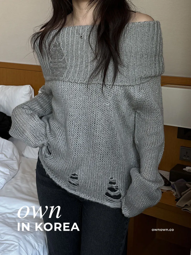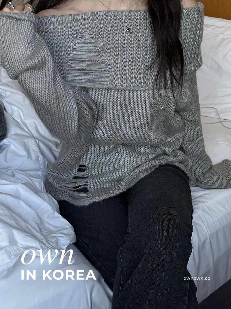 【正韓連線】KR26 壞壞惹人愛 刷破一字領針織上衣
