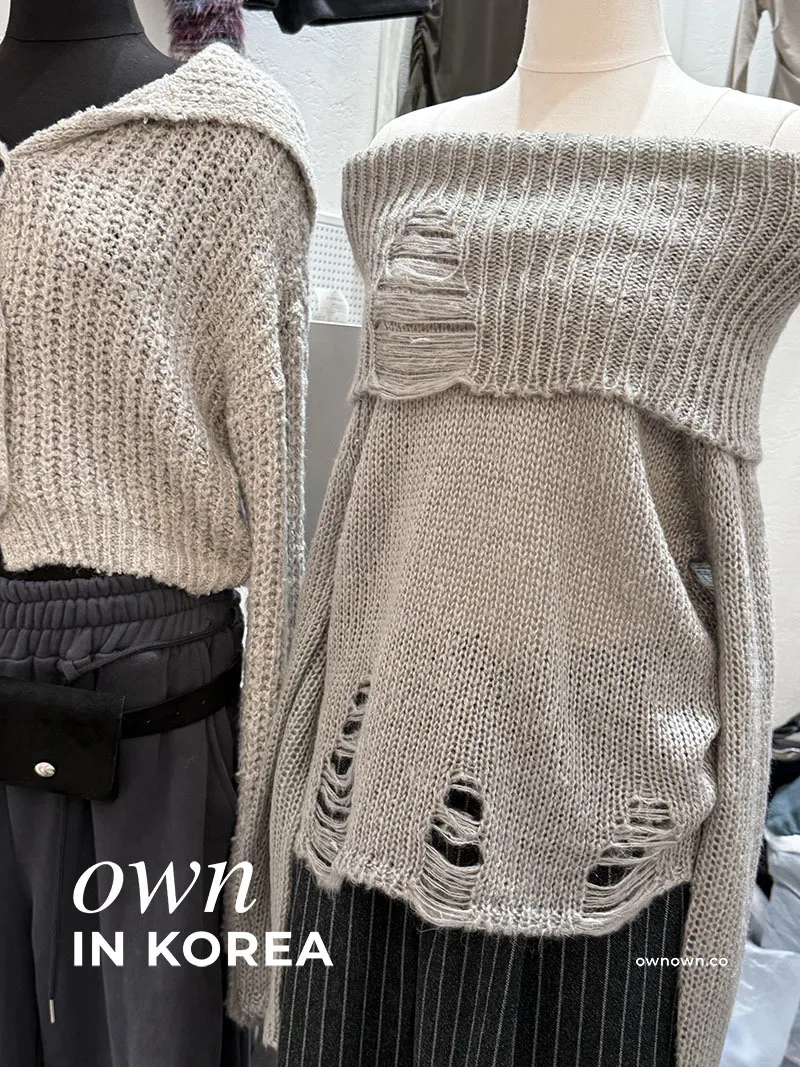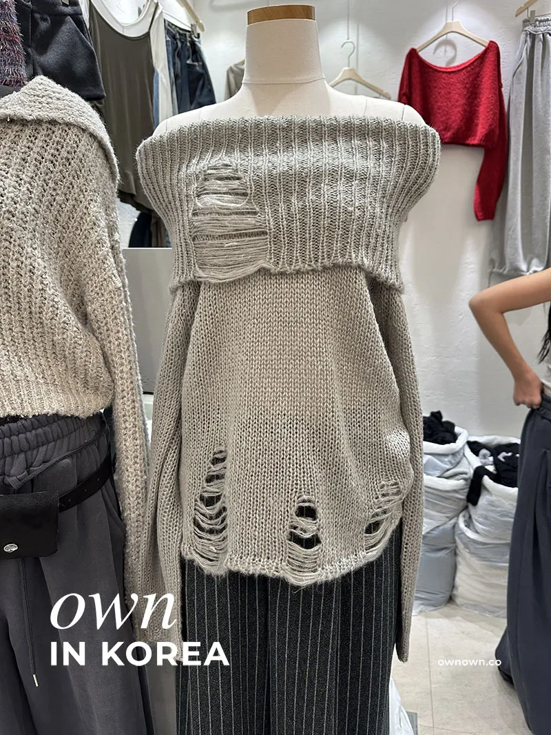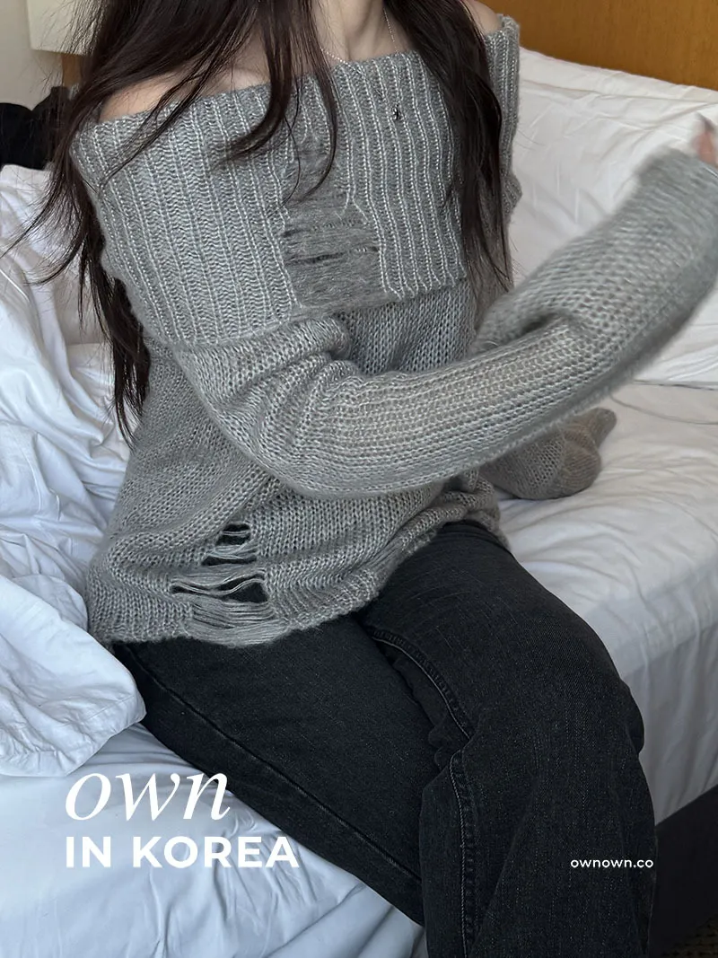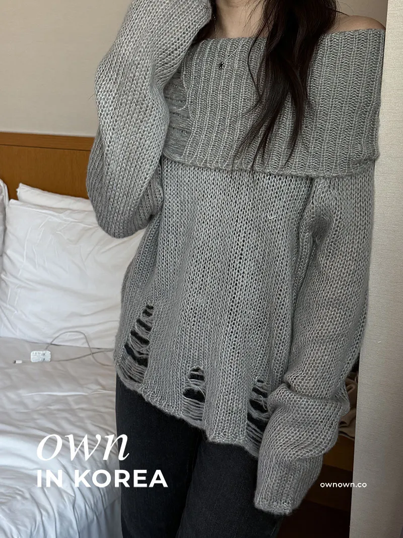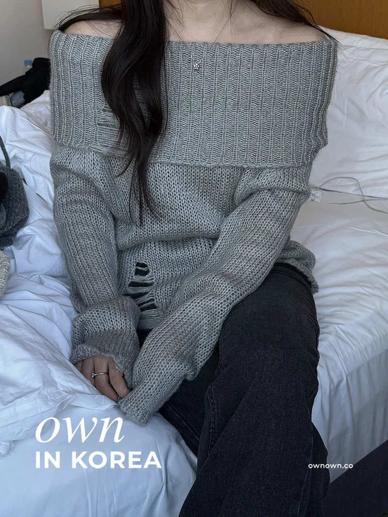 【正韓連線】KR26 壞壞惹人愛 刷破一字領針織上衣