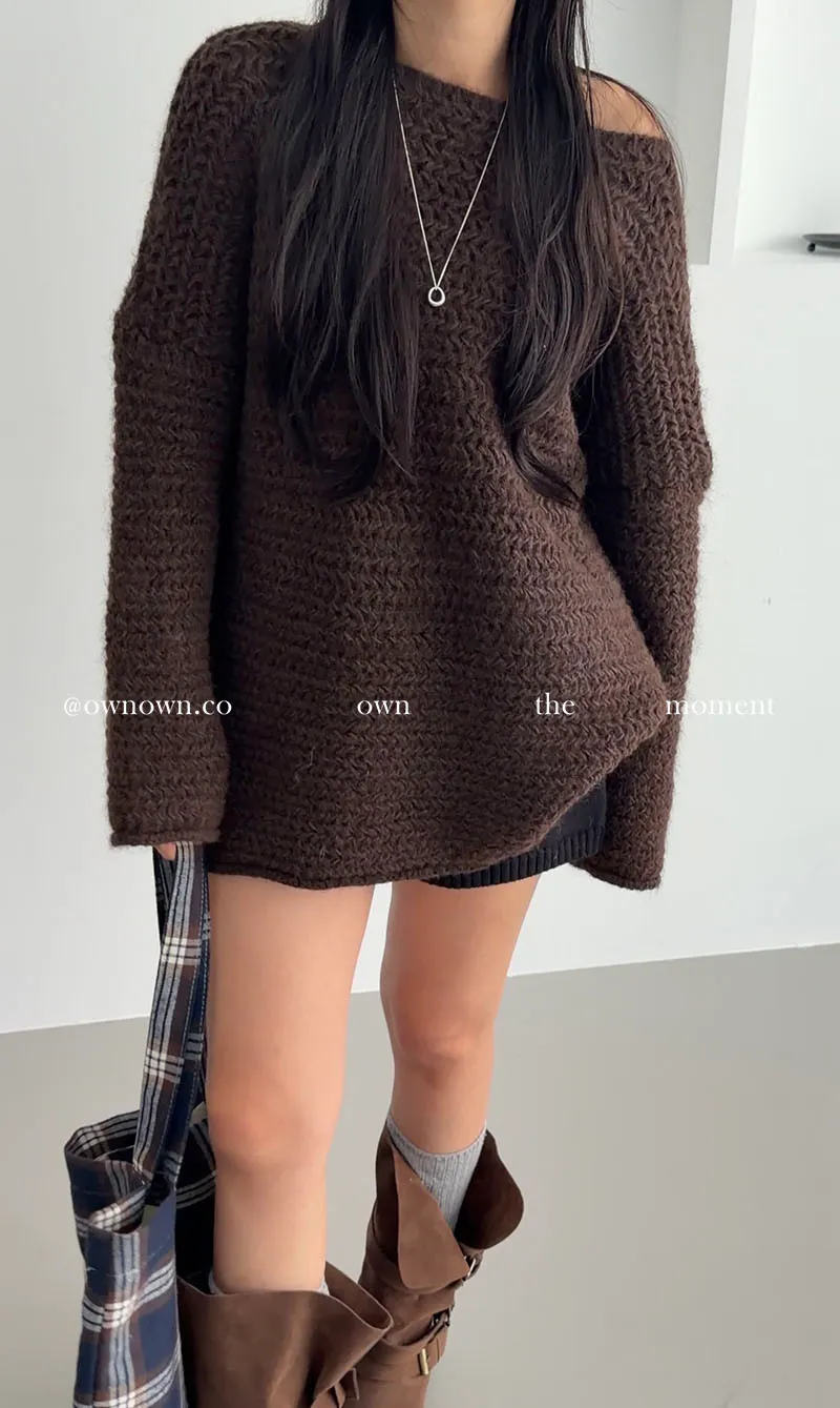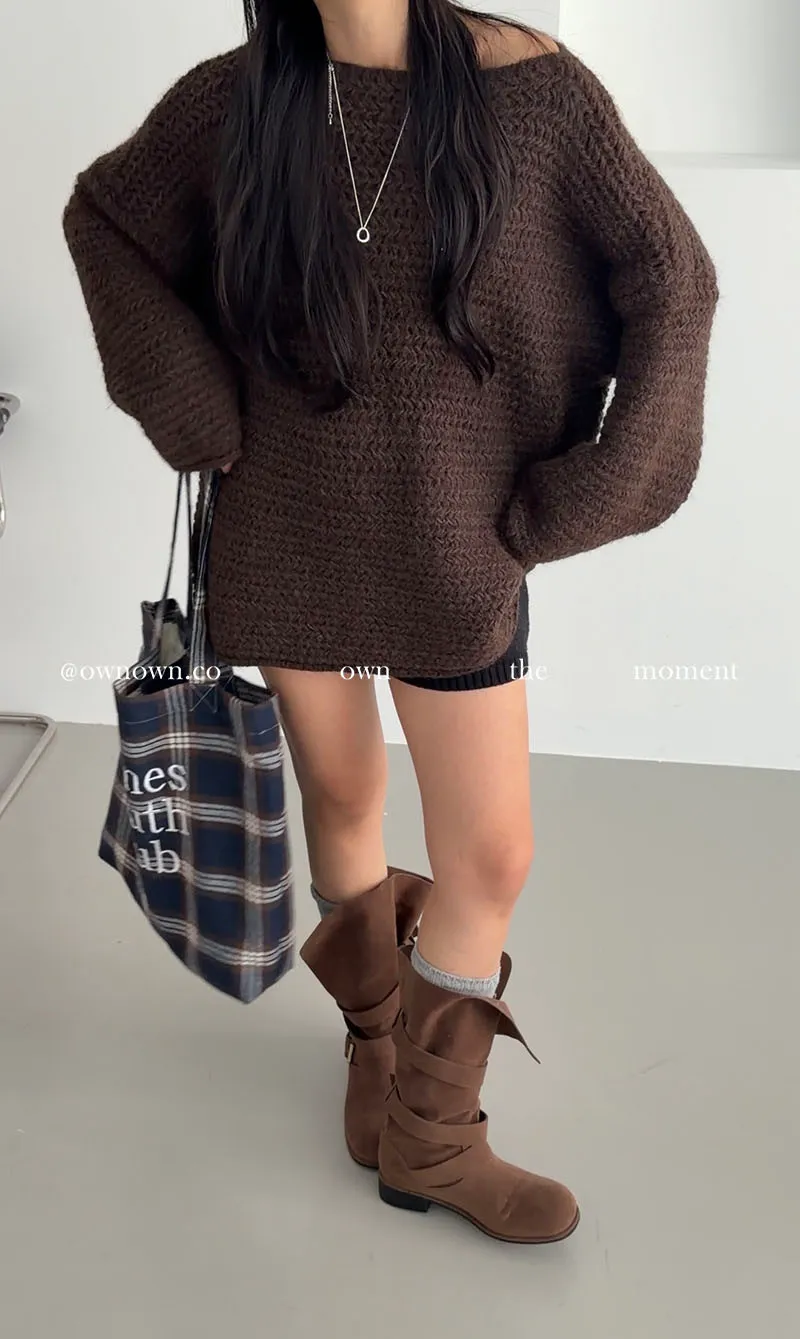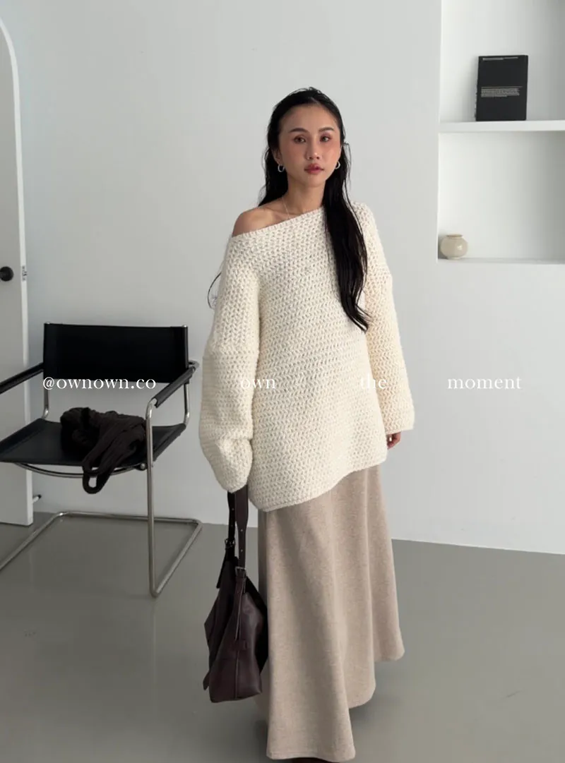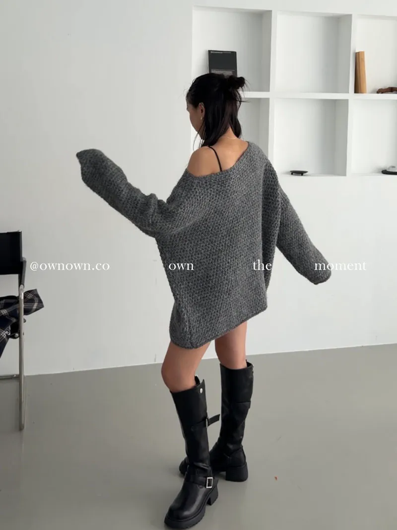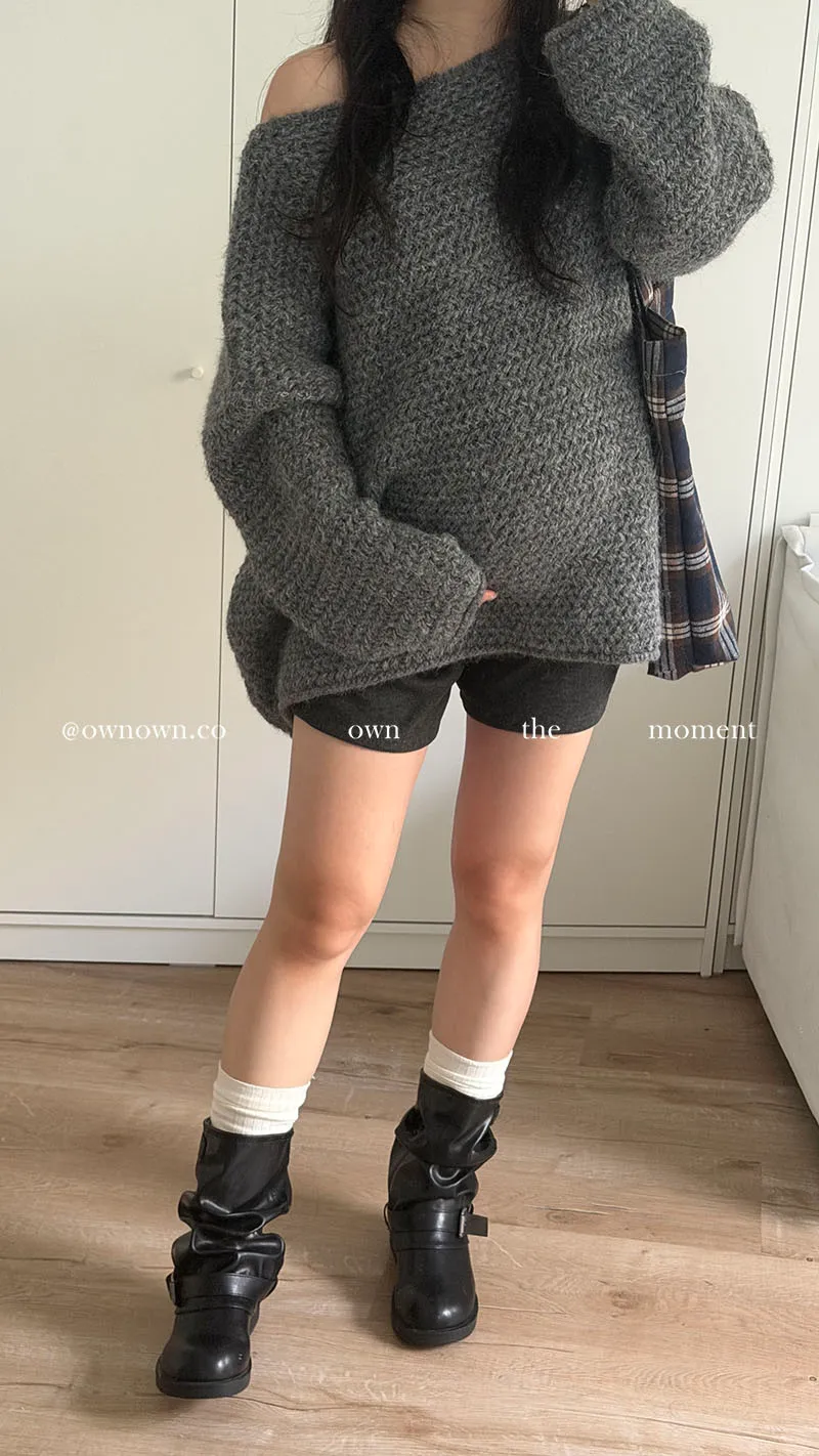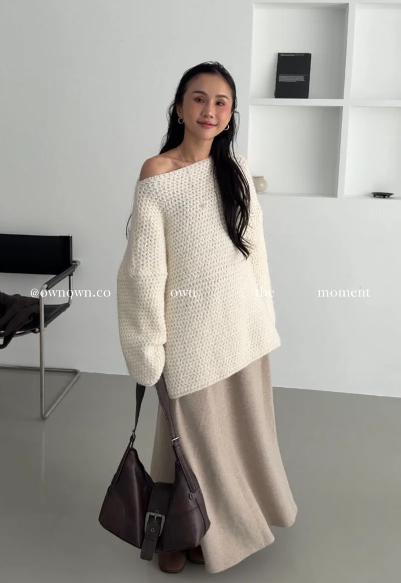 慵懶感爆棚 一字領寬袖粗織毛衣 3colors