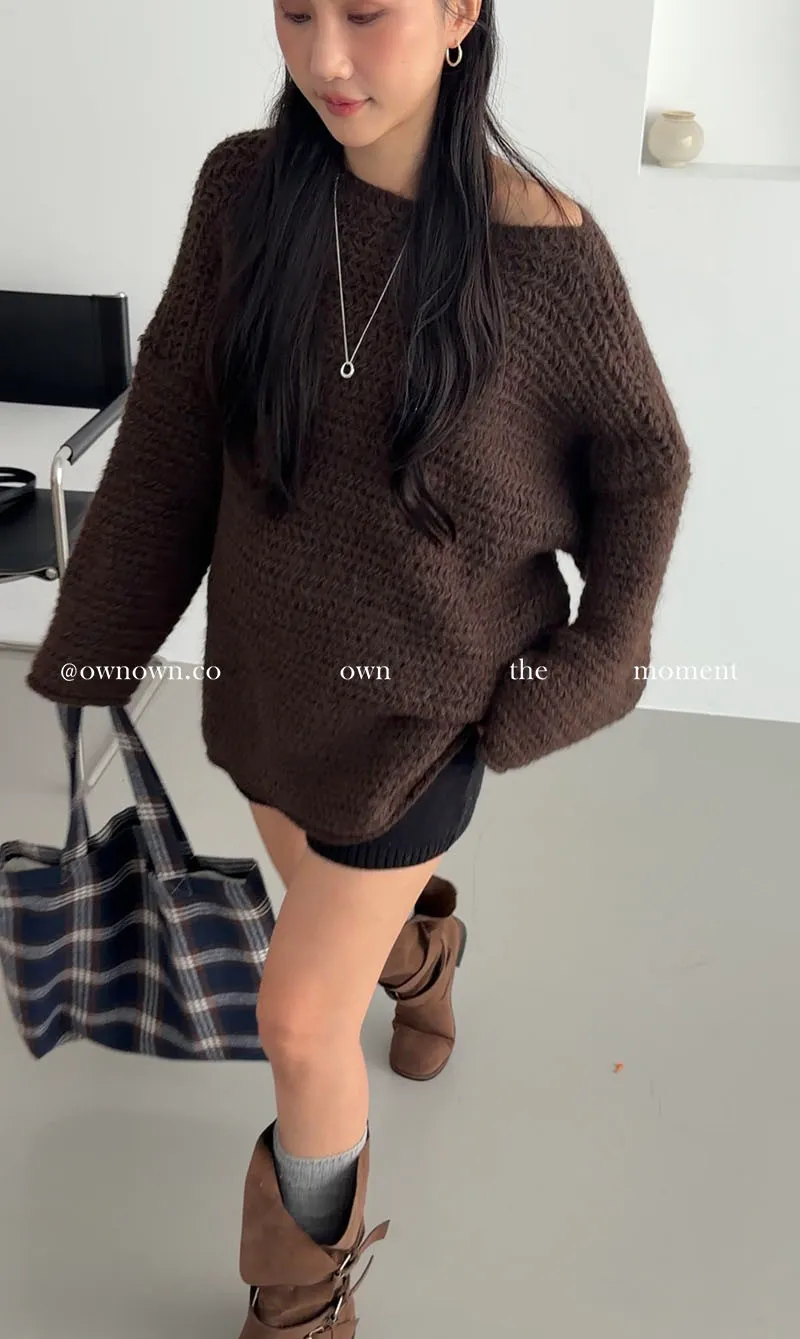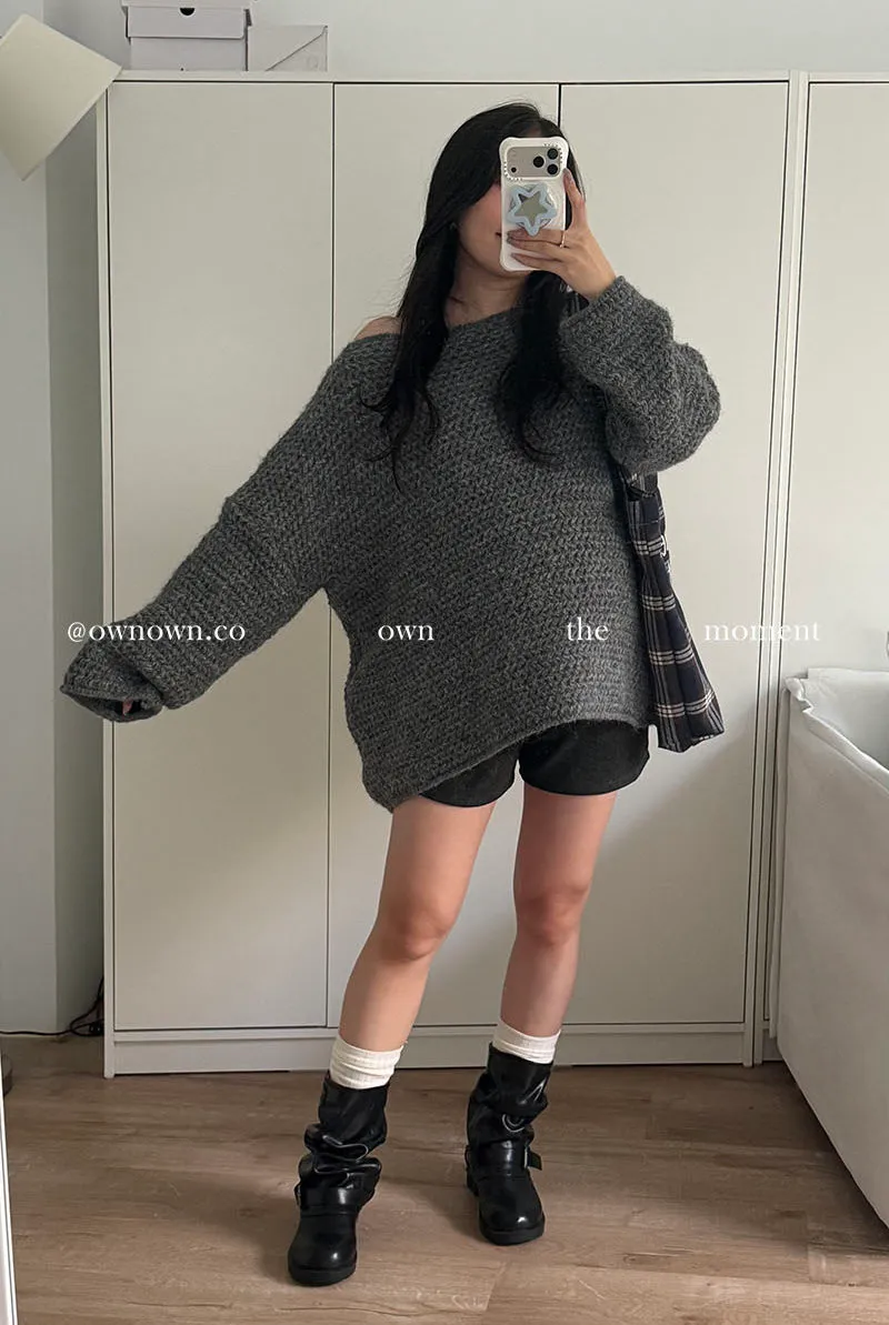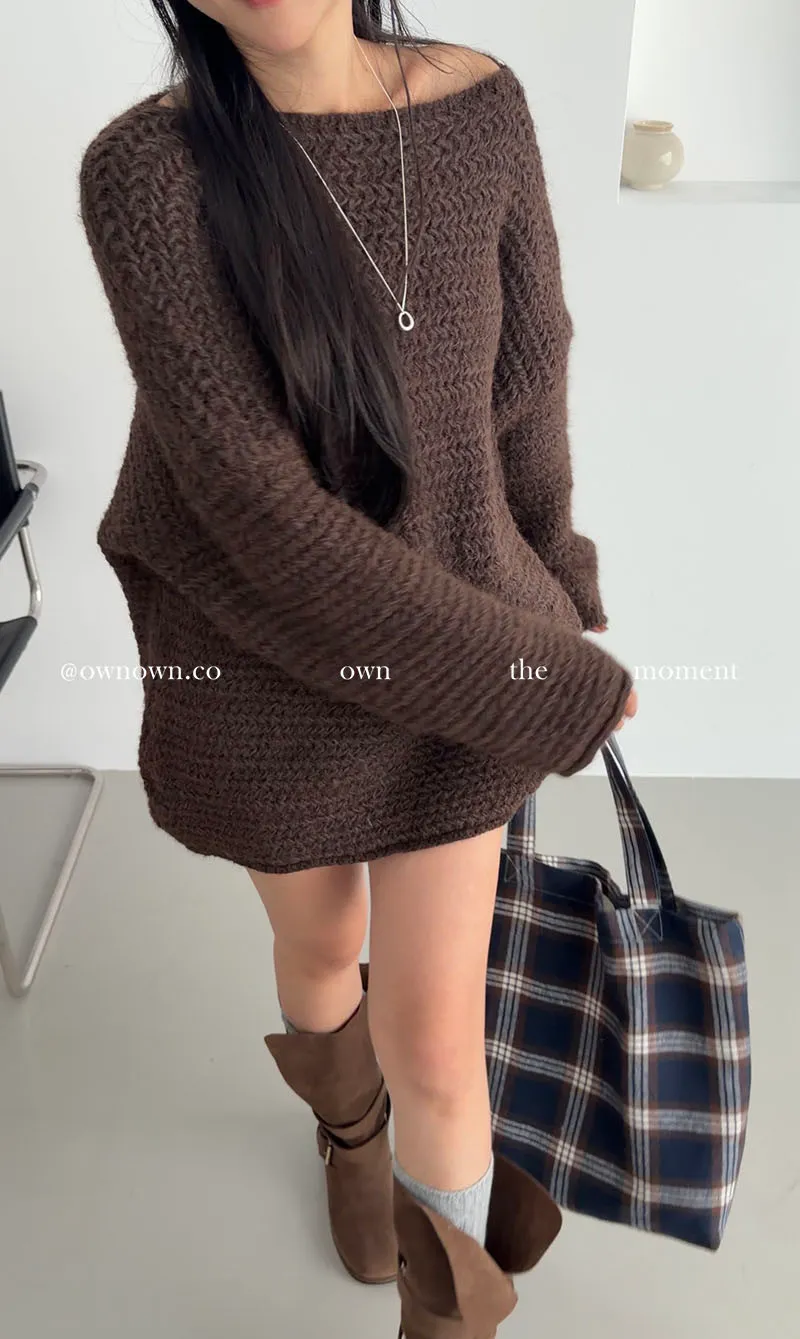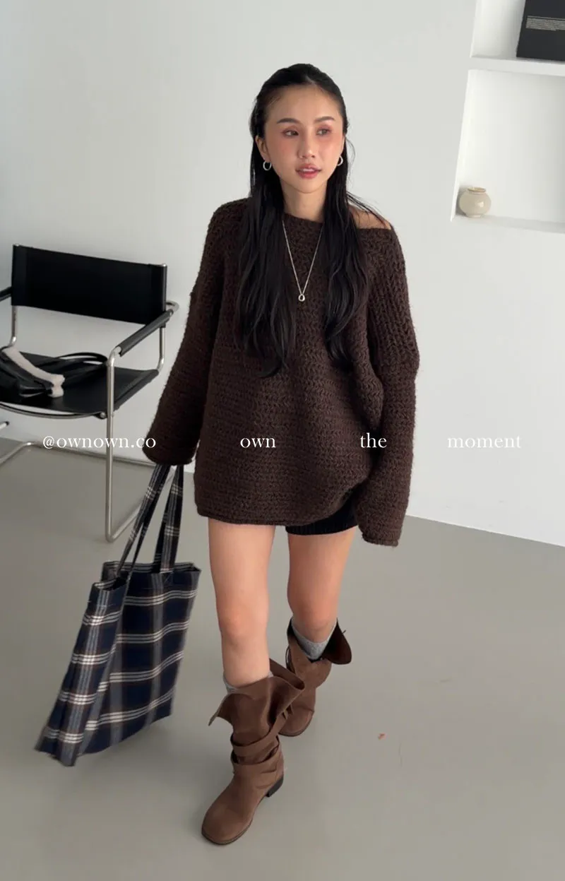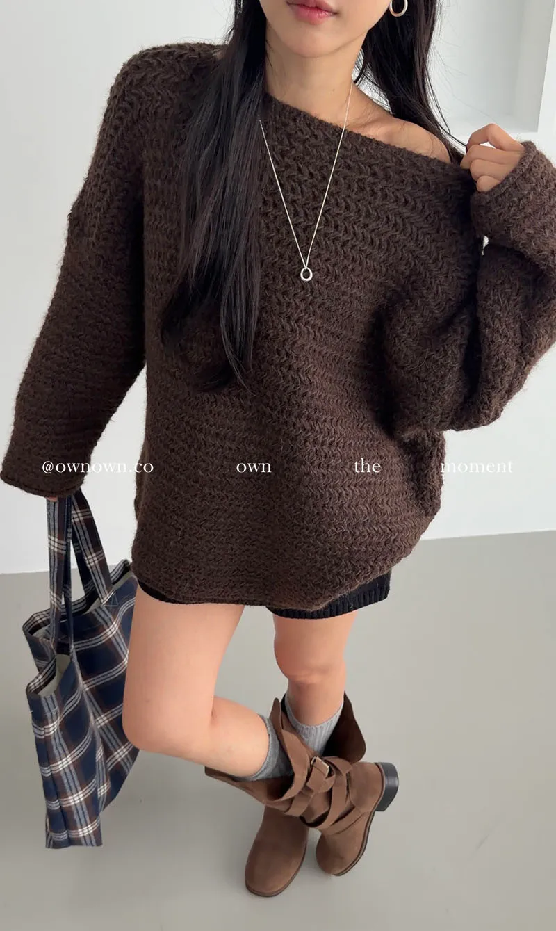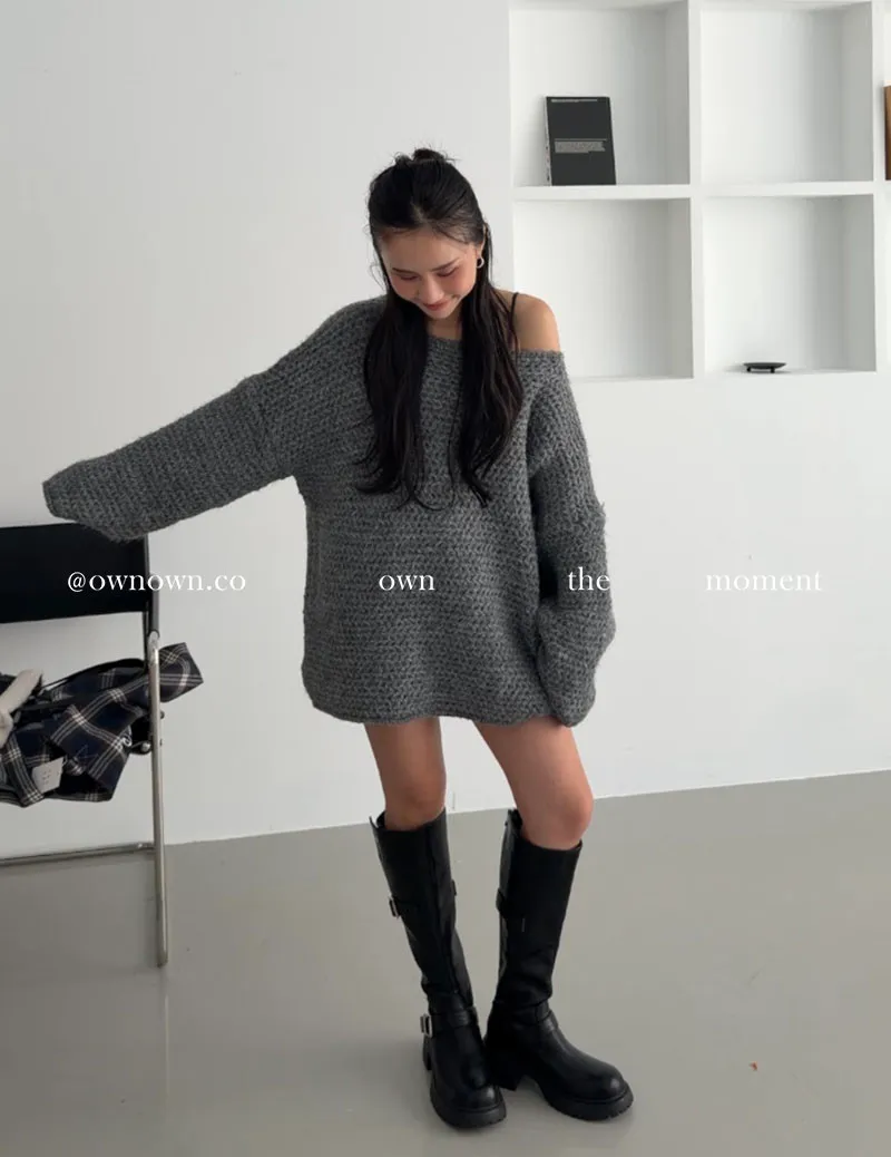 慵懶感爆棚 一字領寬袖粗織毛衣 3colors