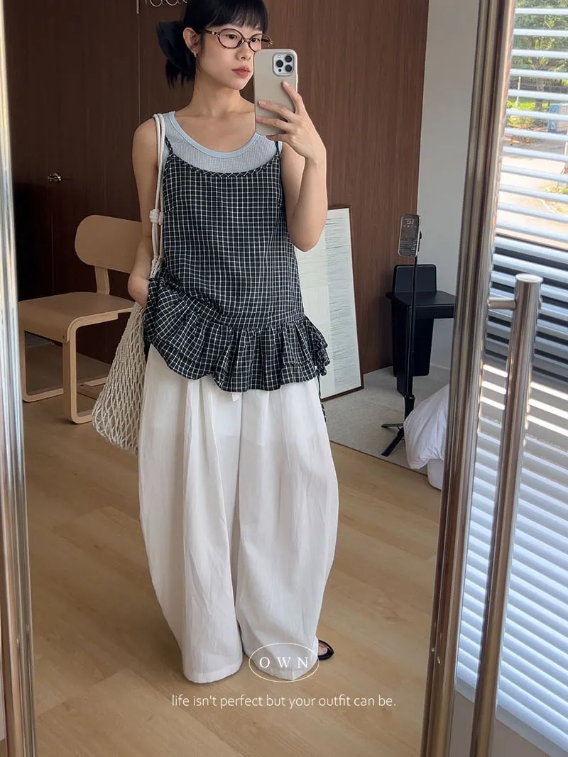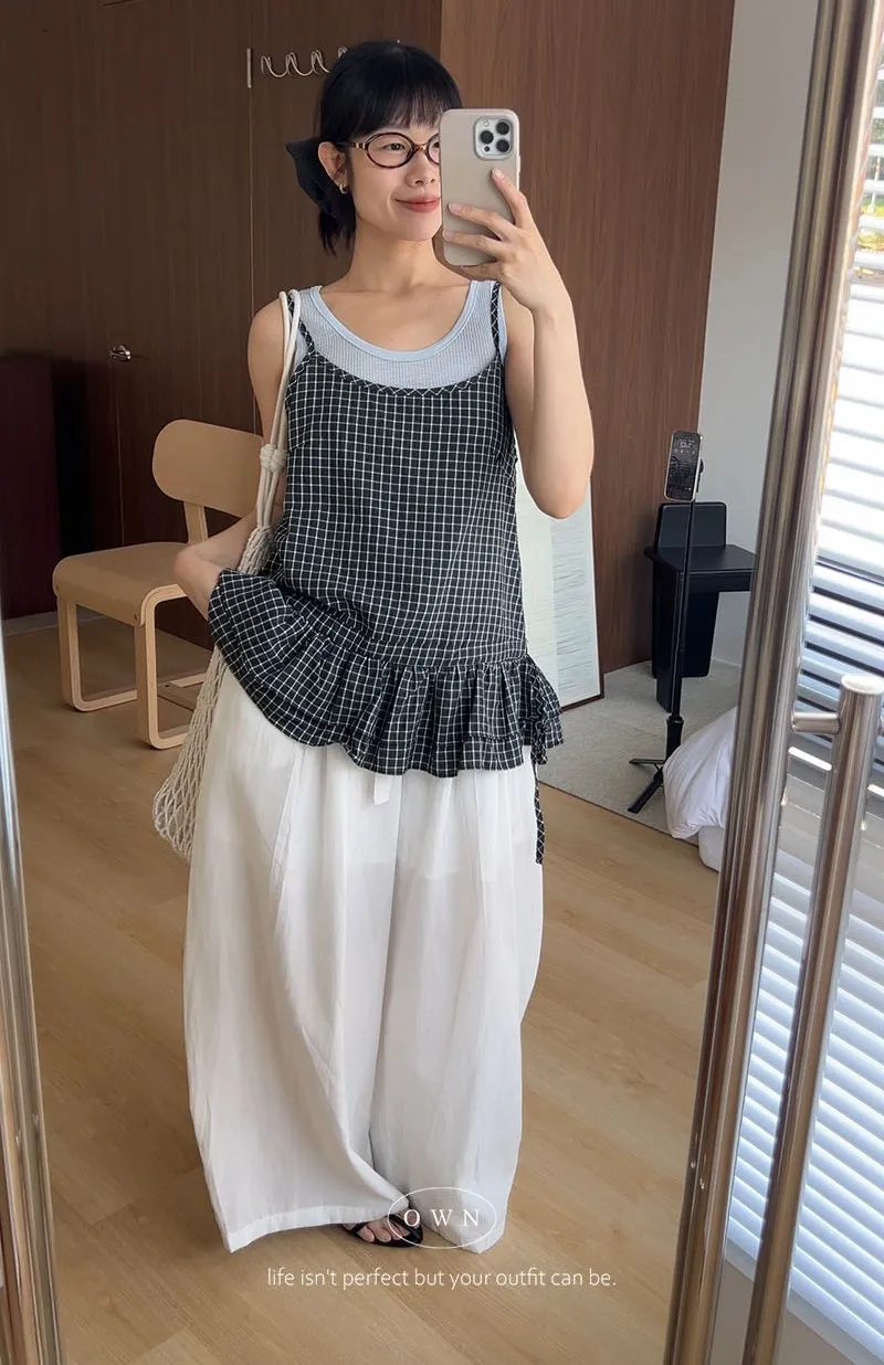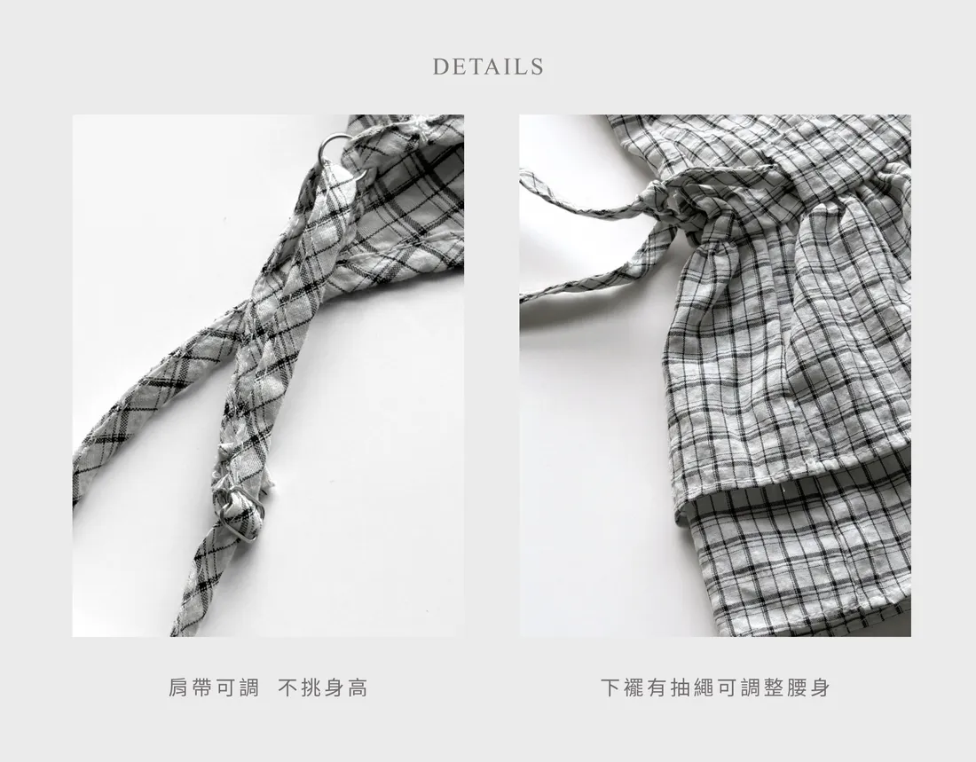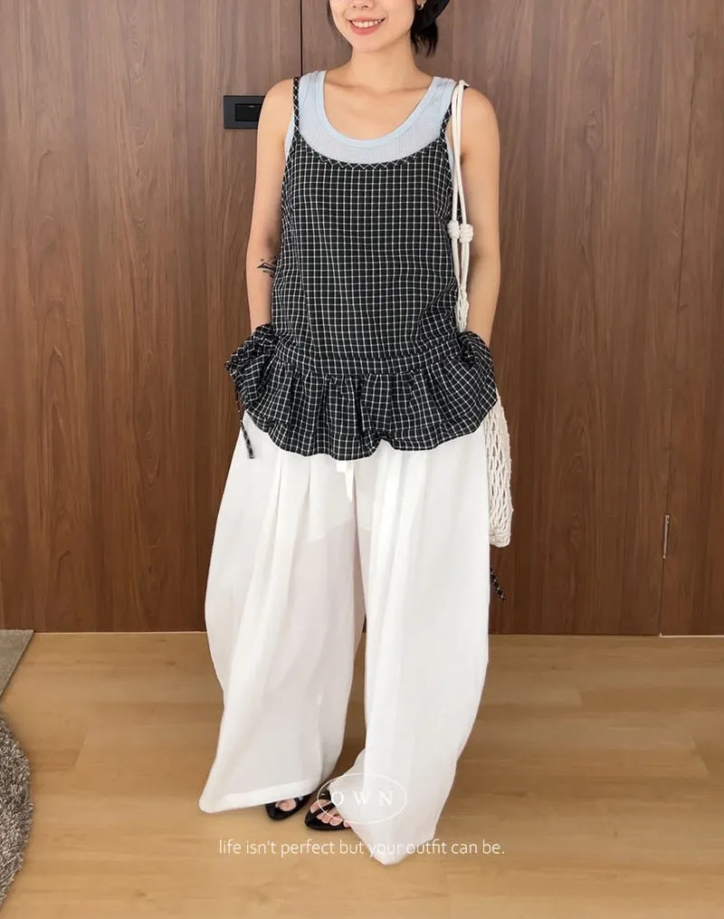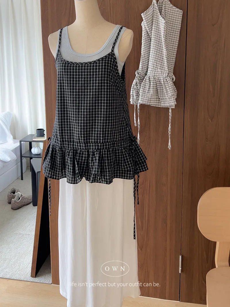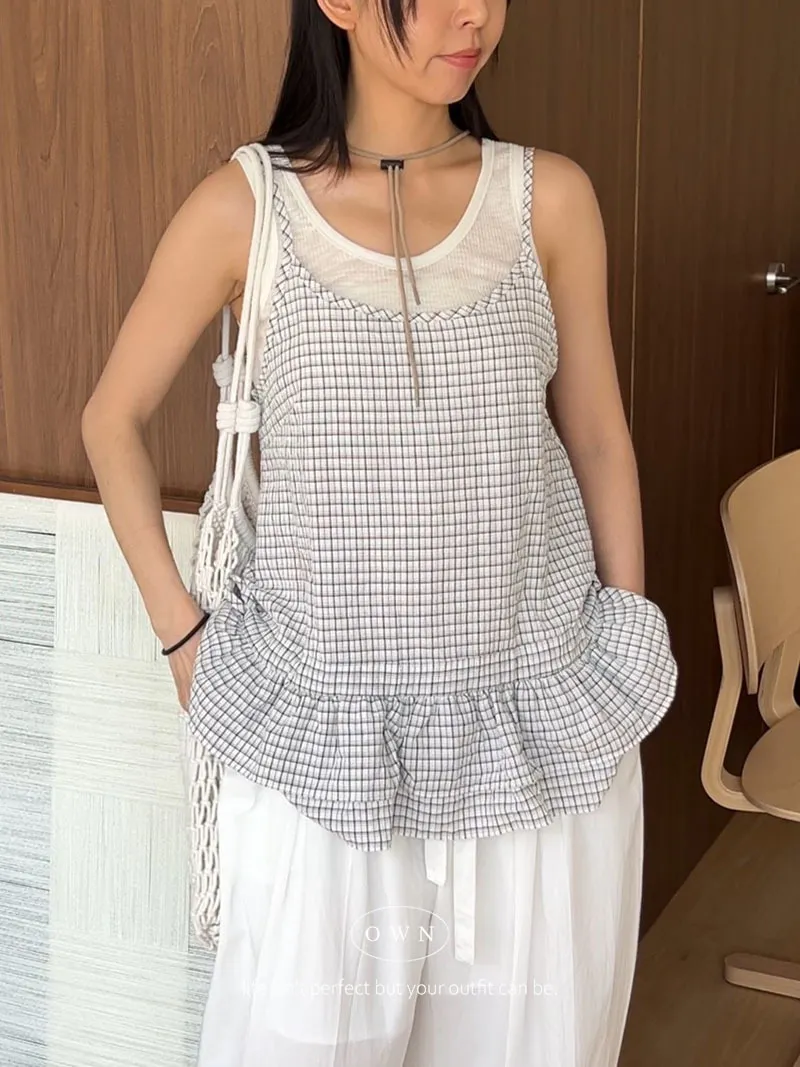 【兩件組合價$800】完美詮釋酷甜感 荷葉裙襬細肩格紋背心 2colors