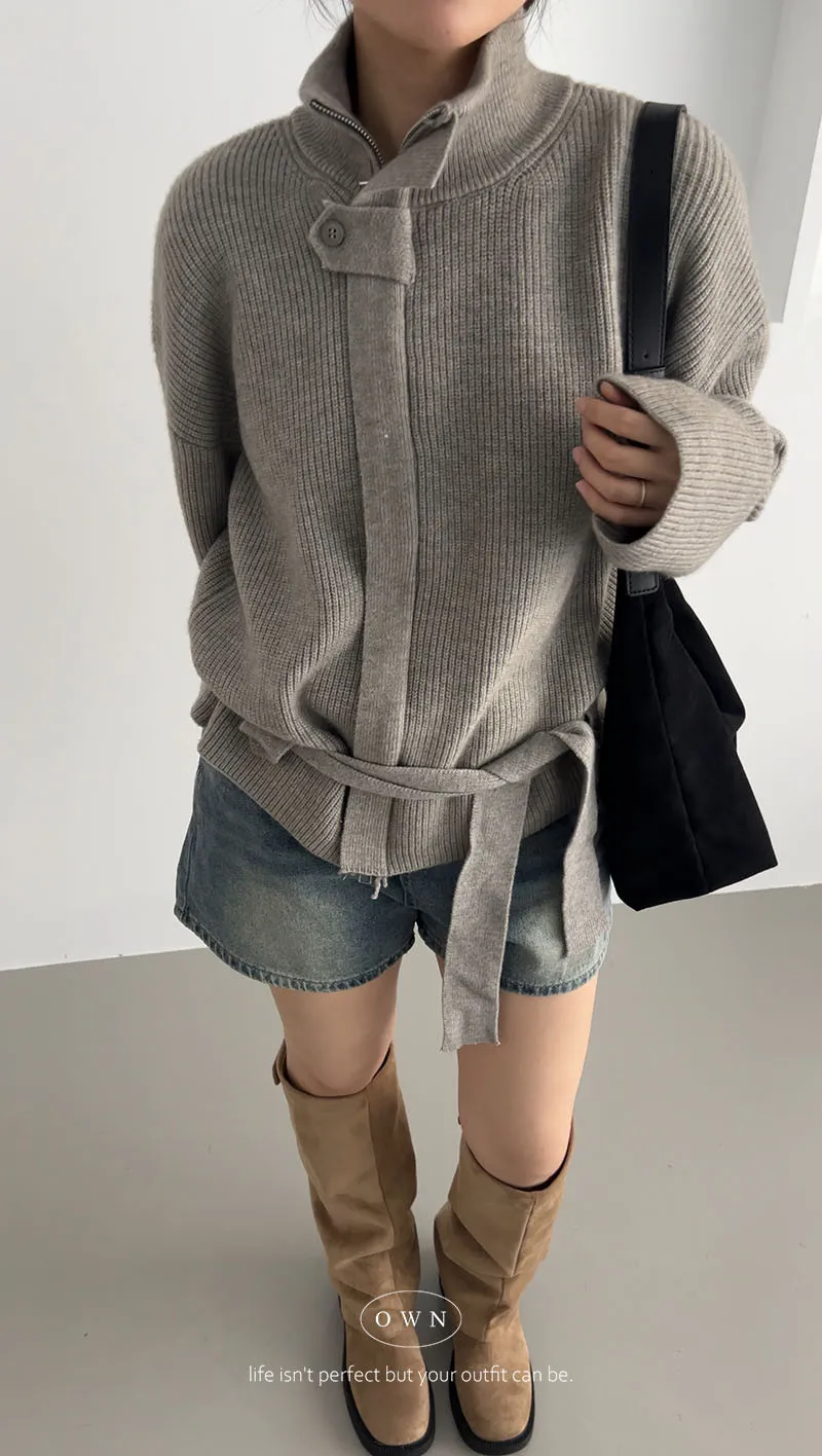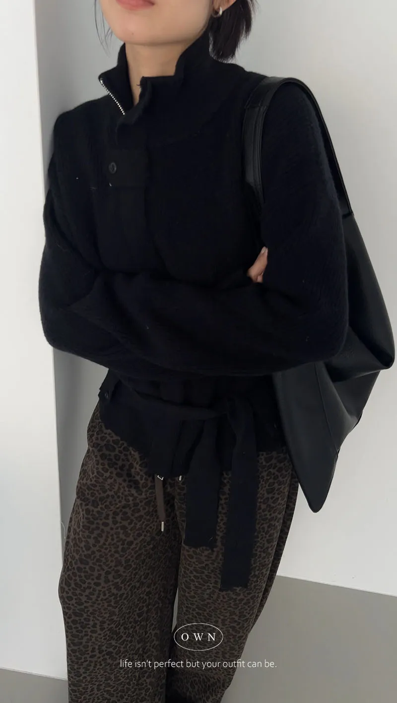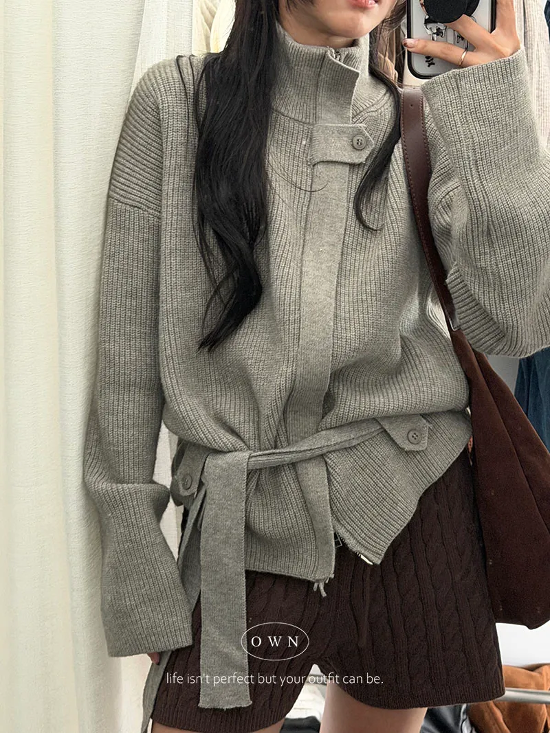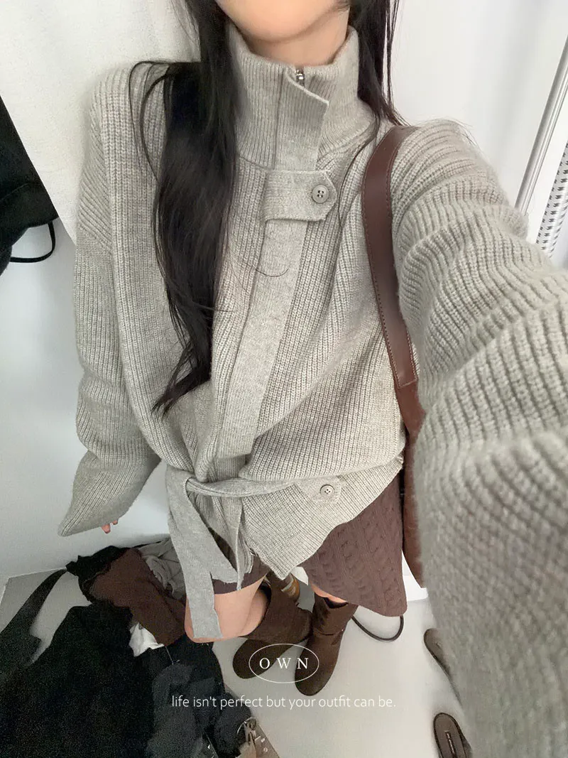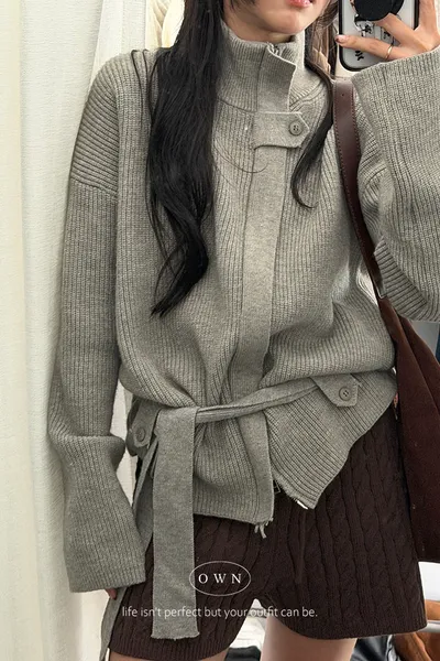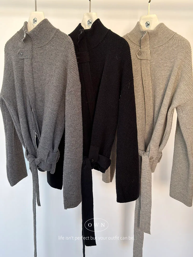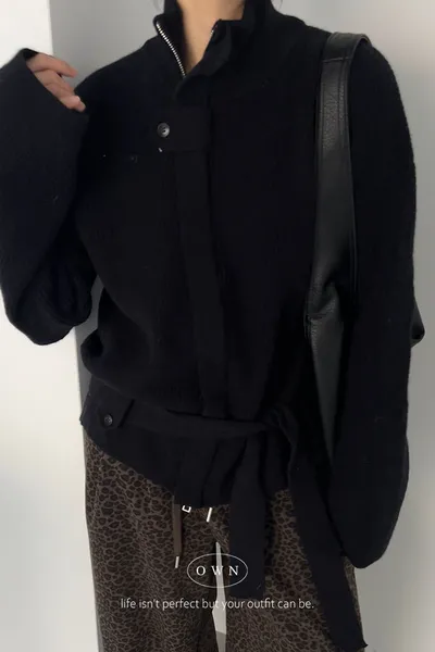 給你俐落高質感 直坑紋立領拉鍊綁帶上衣 3colors