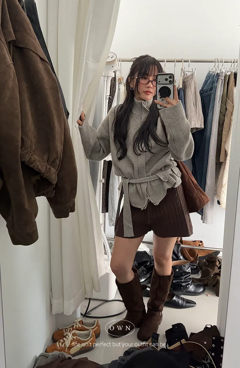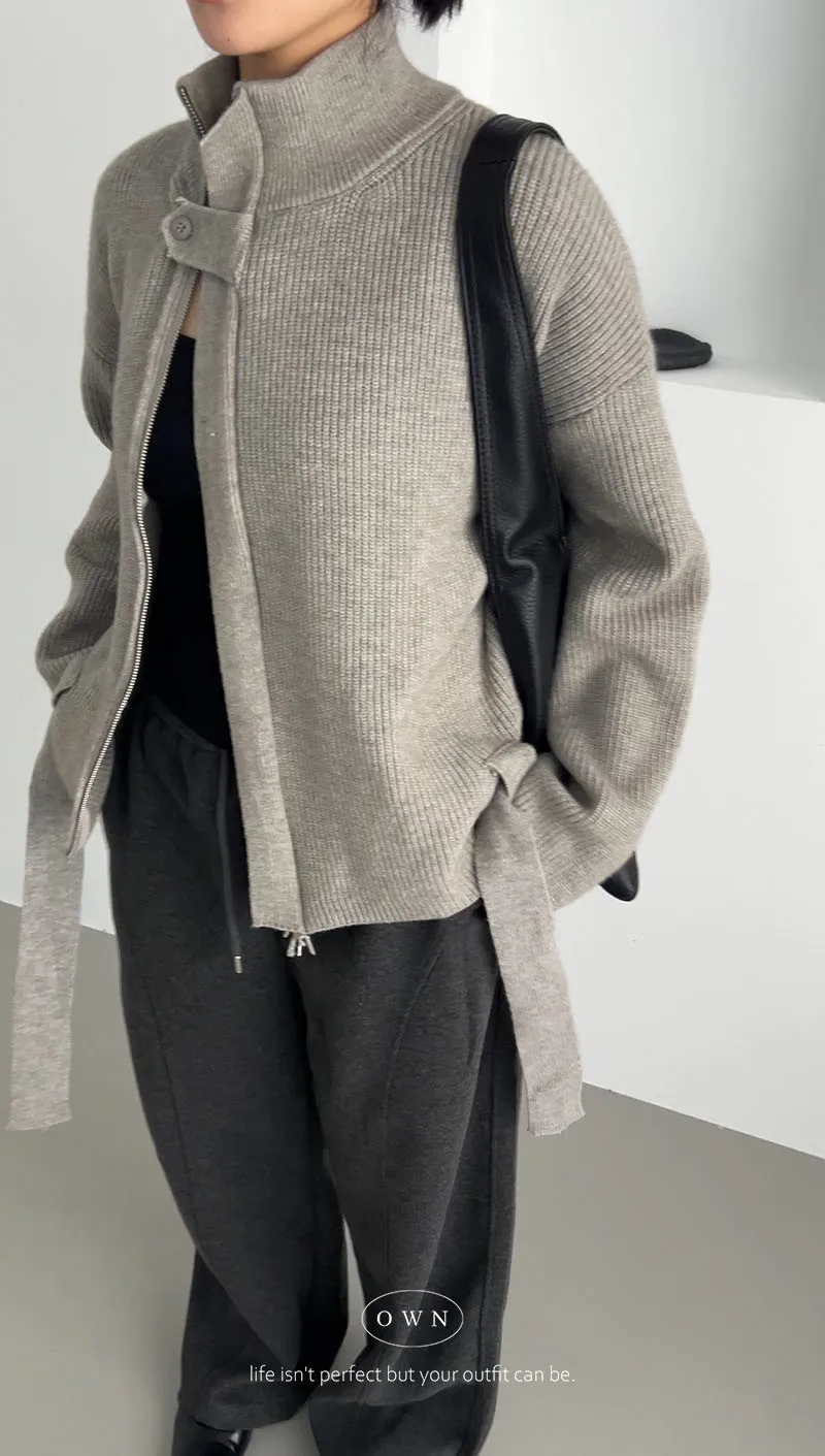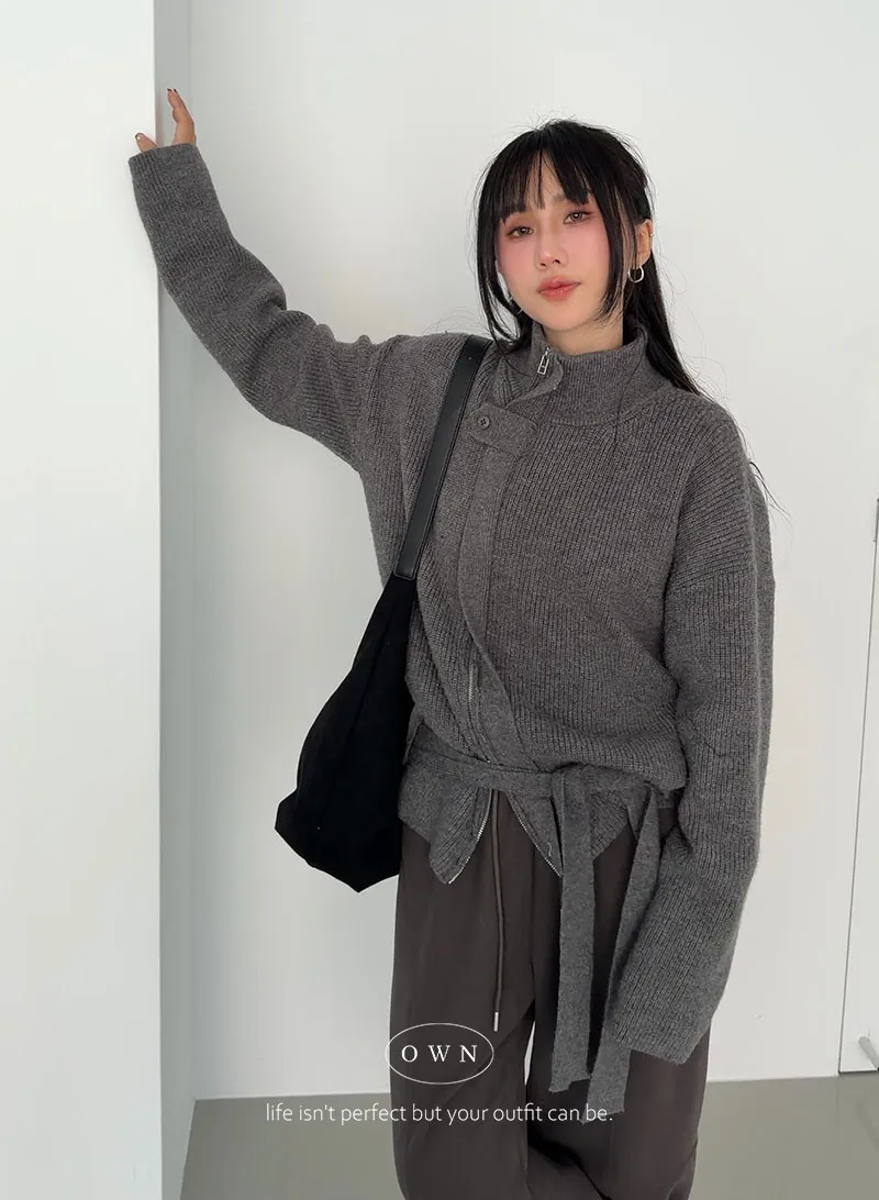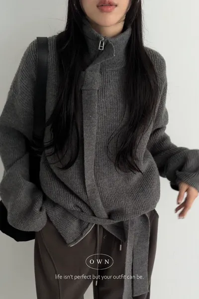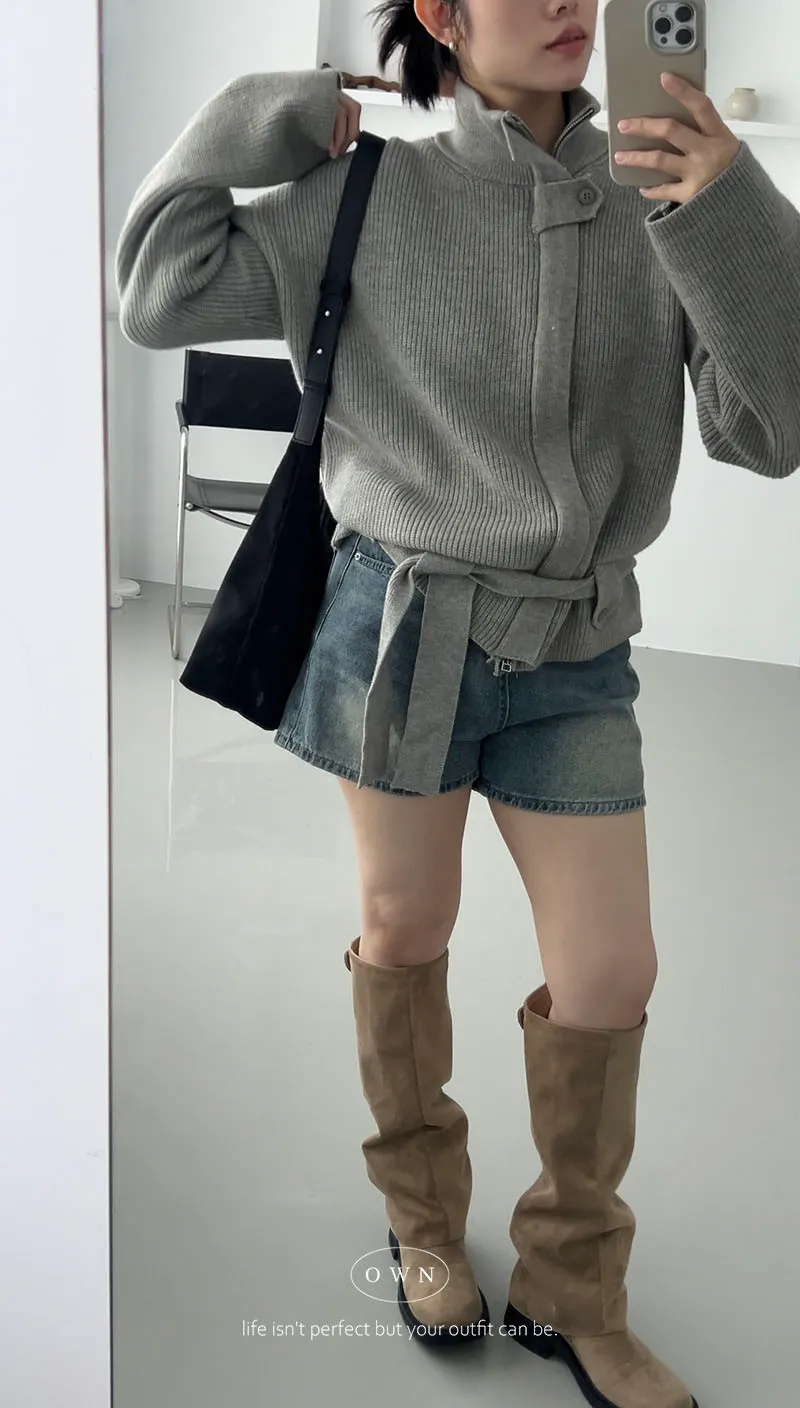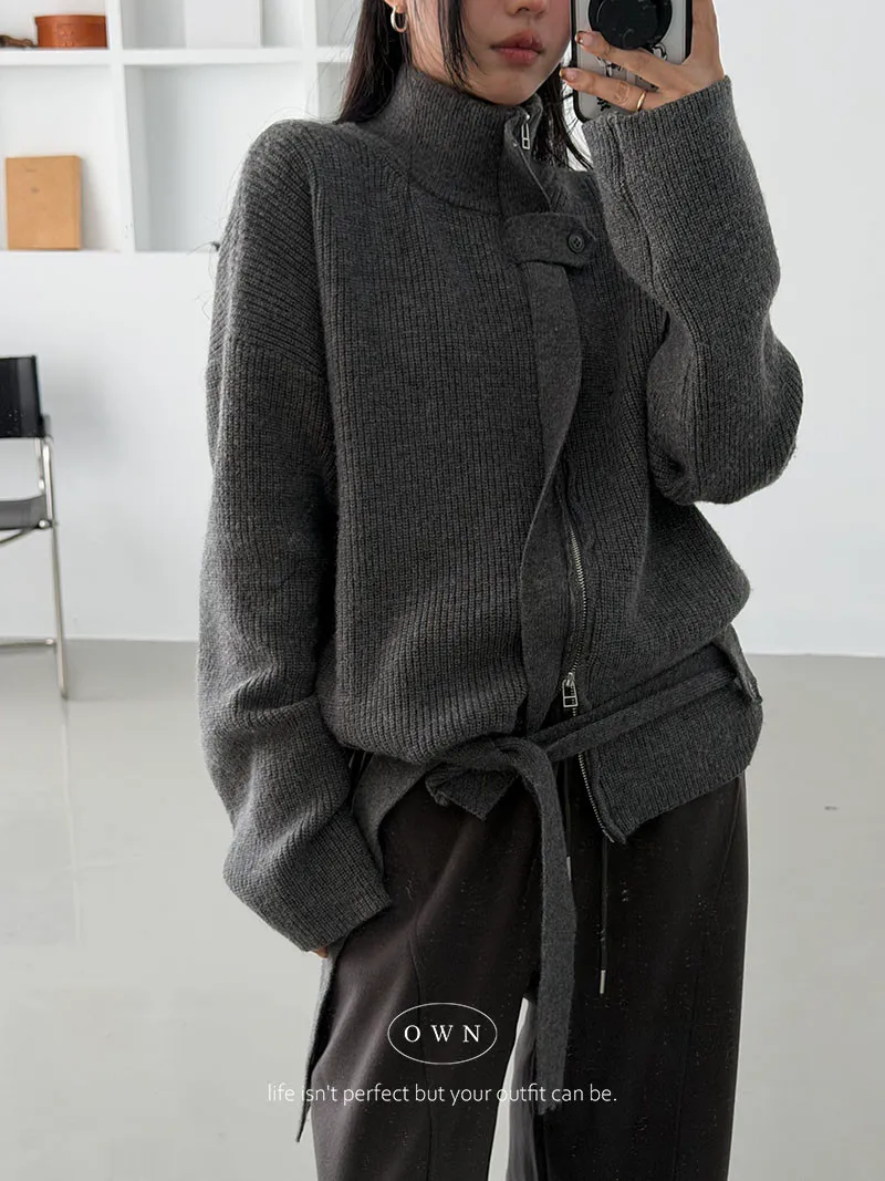給你俐落高質感 直坑紋立領拉鍊綁帶上衣 3colors