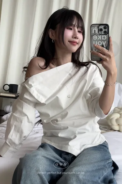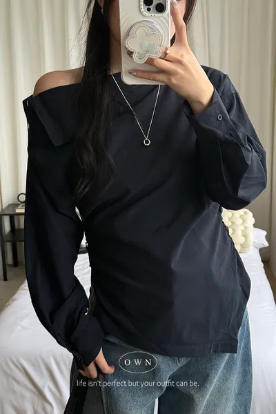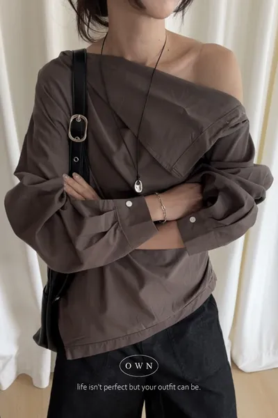 漂亮過秋 翻領一字肩造型感長袖上衣 3colors
