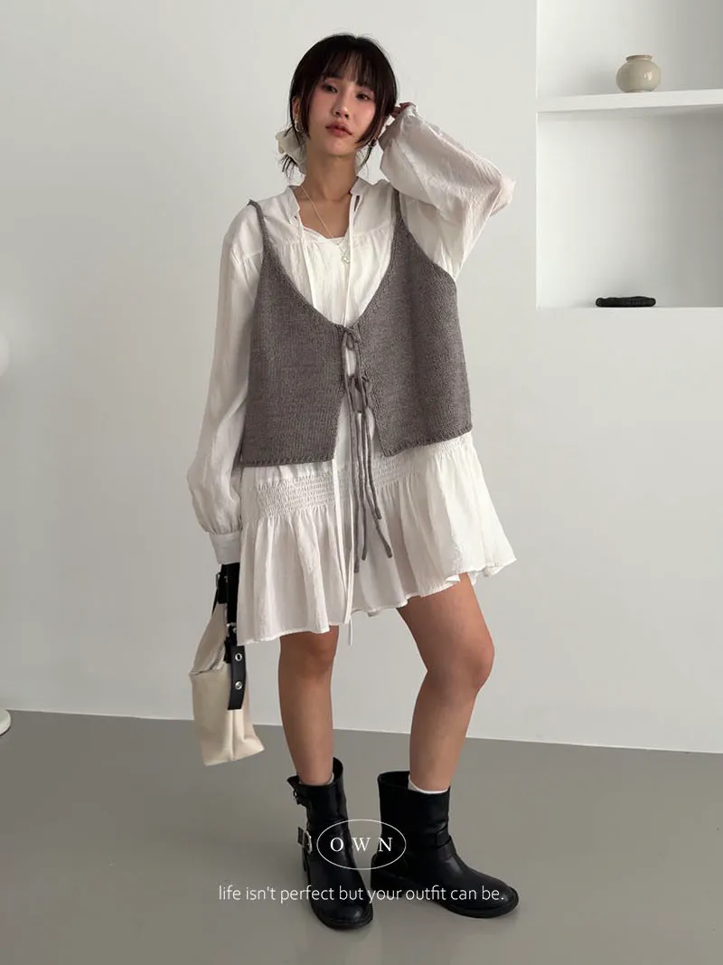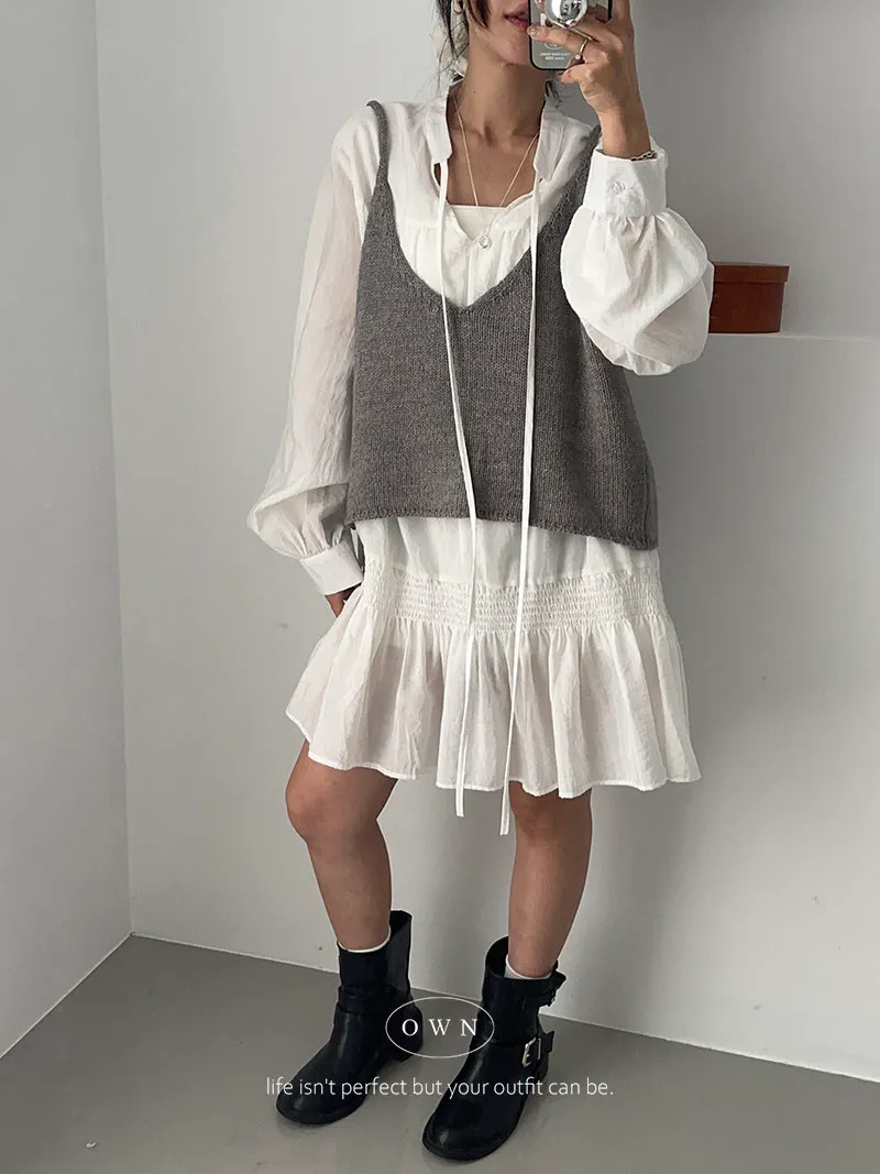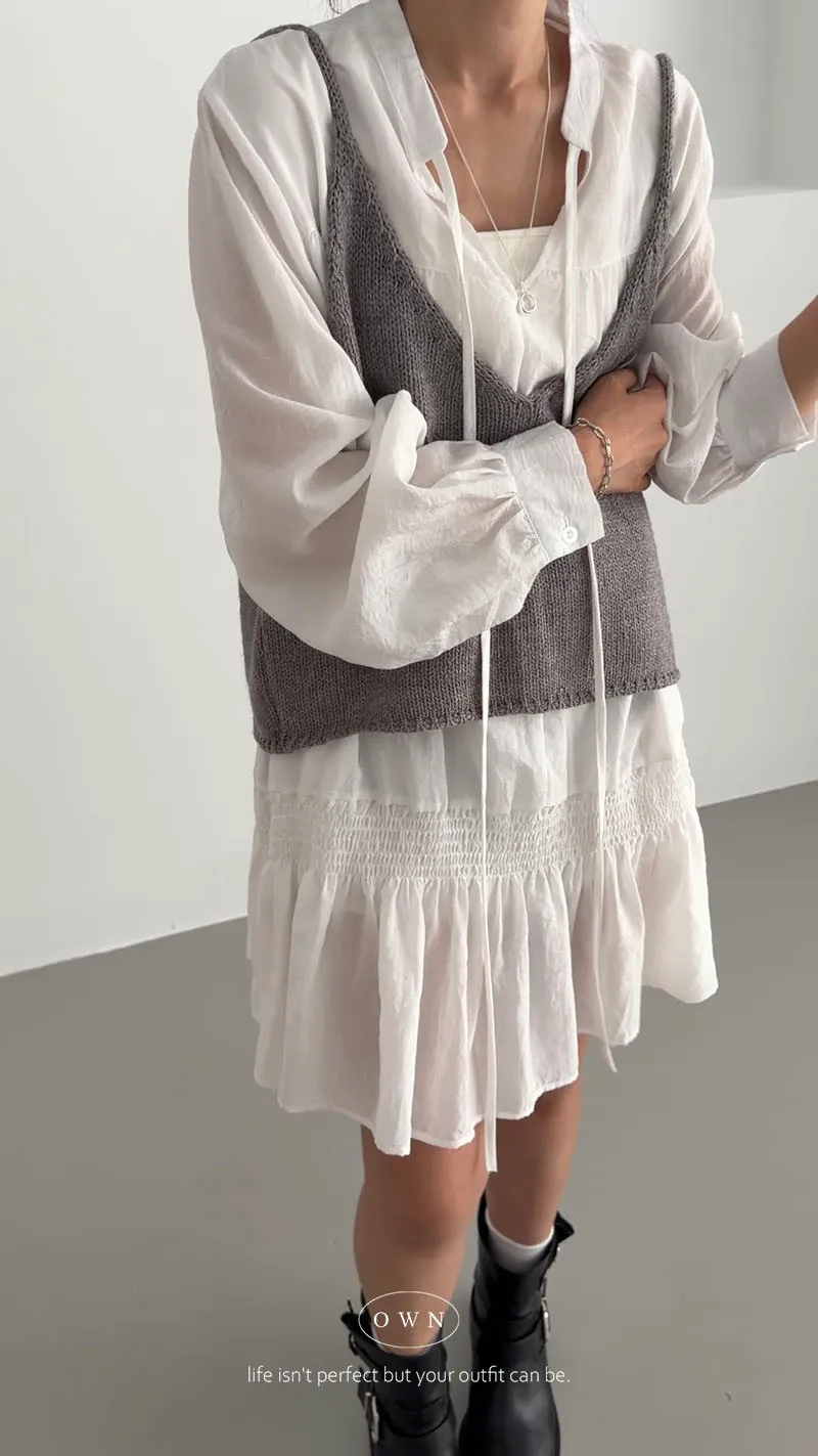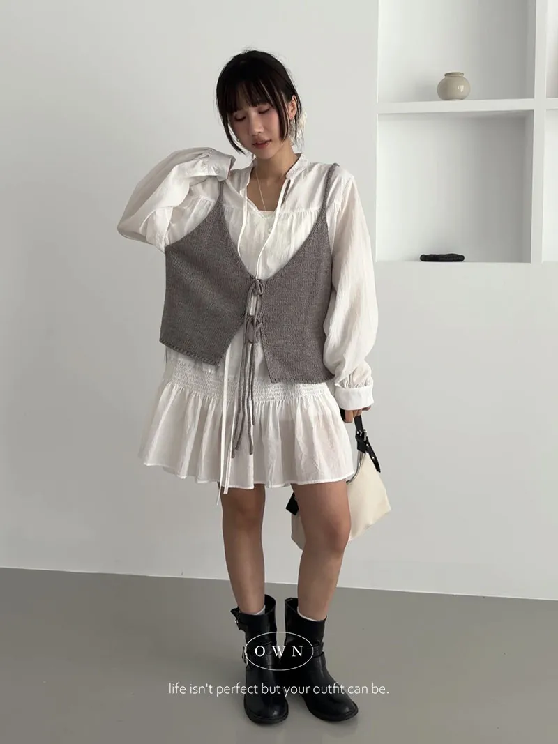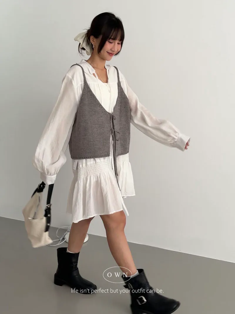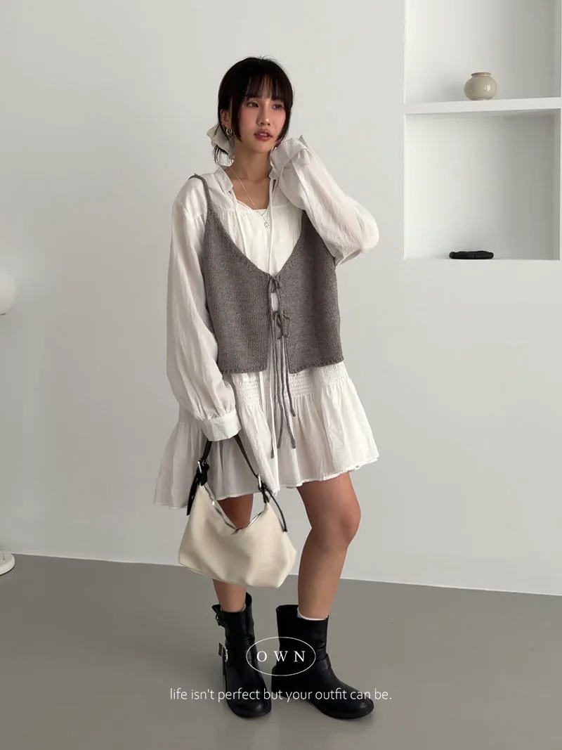 秋日氛圍感 綁帶小立領澎袖洋裝 2colors