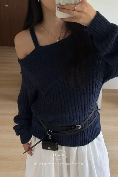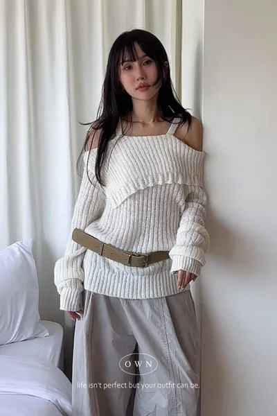 慵懶微醺感 一字肩吊帶針織上衣 3colors