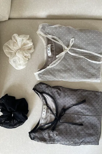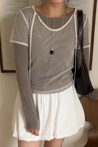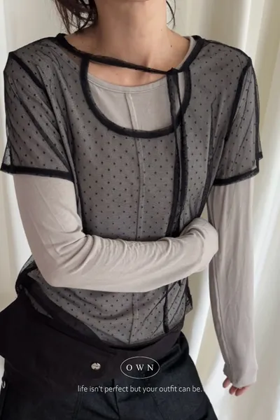 【三件組】少女感!!點點網紗外搭+軟彈長袖+大腸髮圈SET 2colors