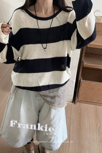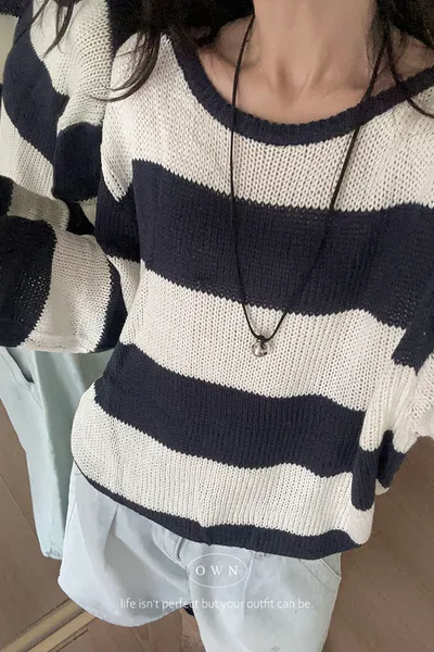 日常也要慵懶 條紋捲邊圓領針織長袖上衣