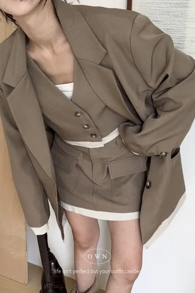 初秋質感套裝 三件套卡其西外+西裝背心+俐落短裙SET S/M