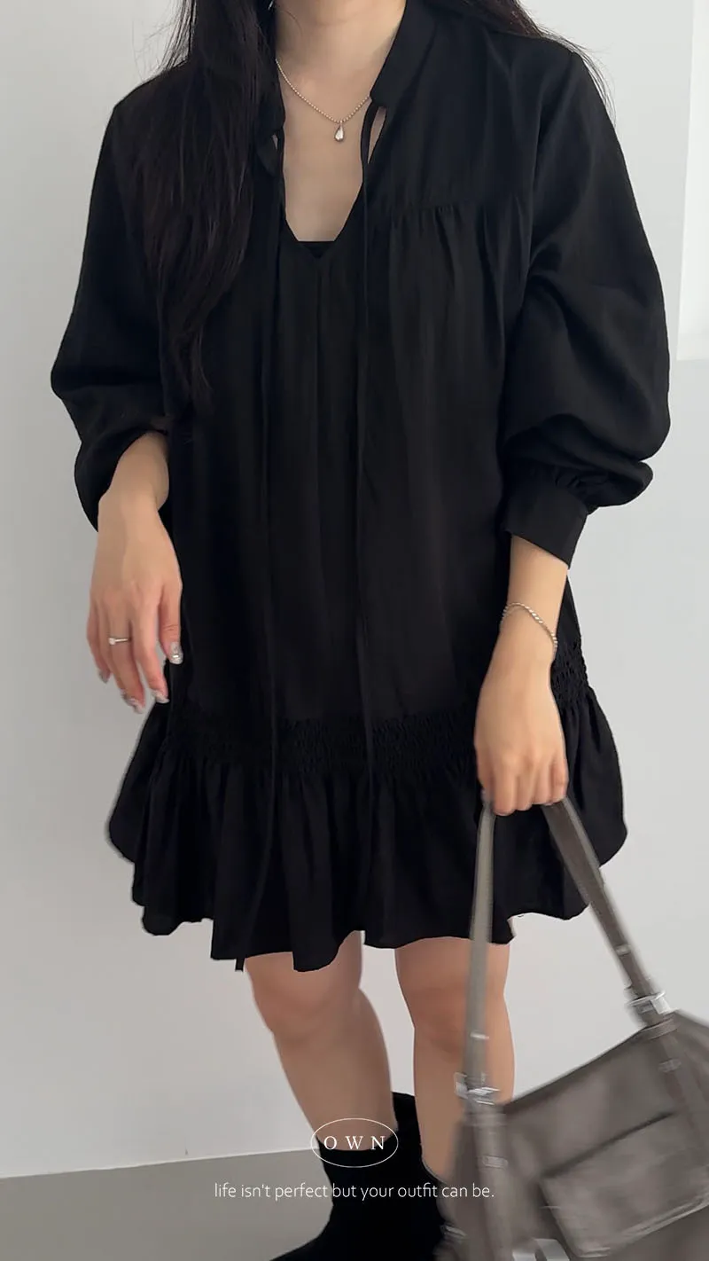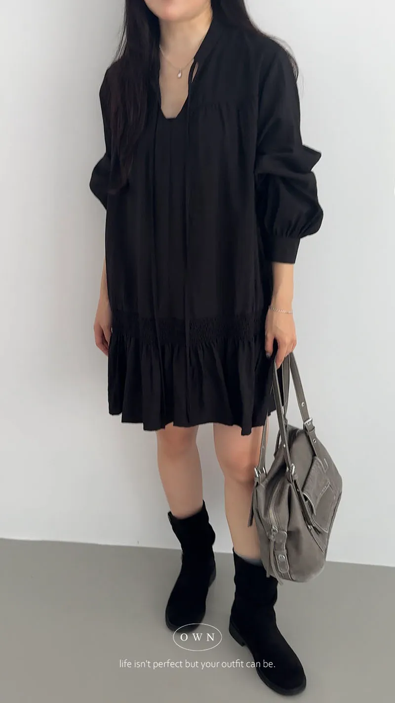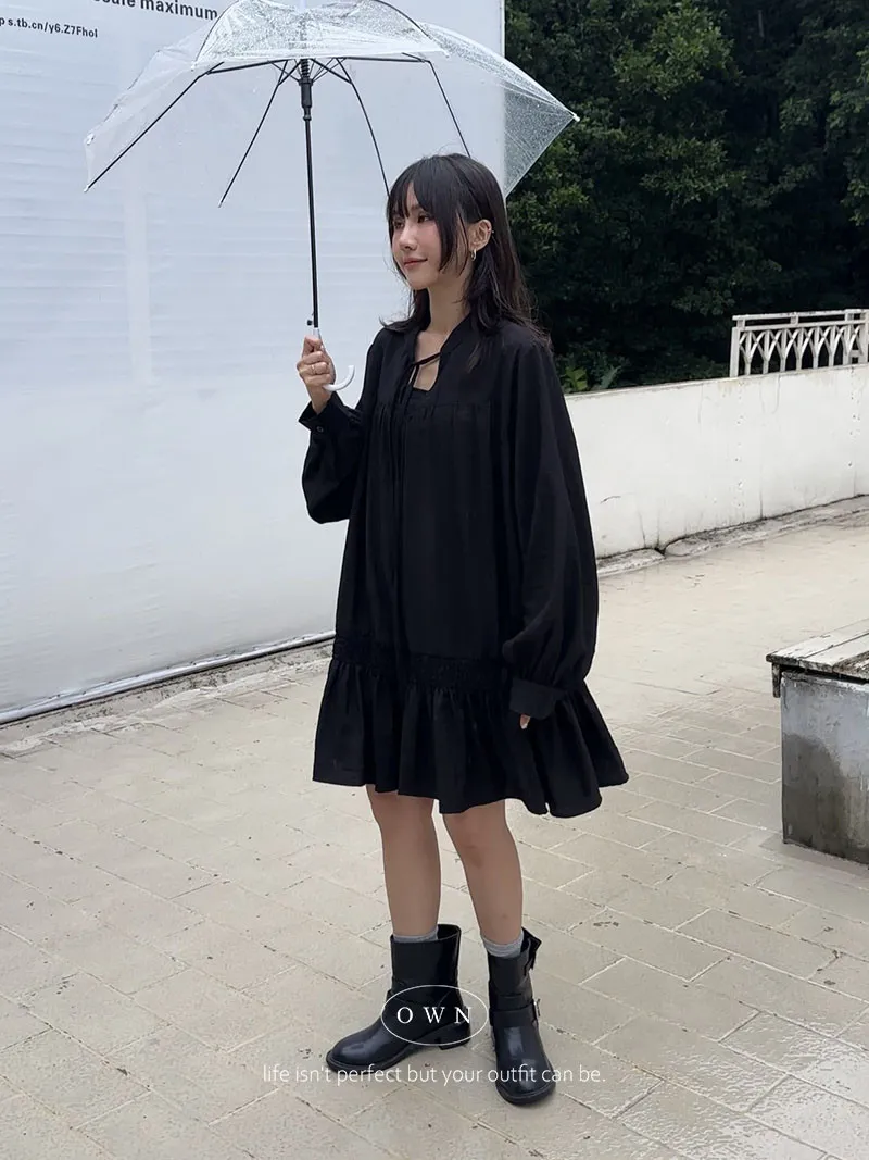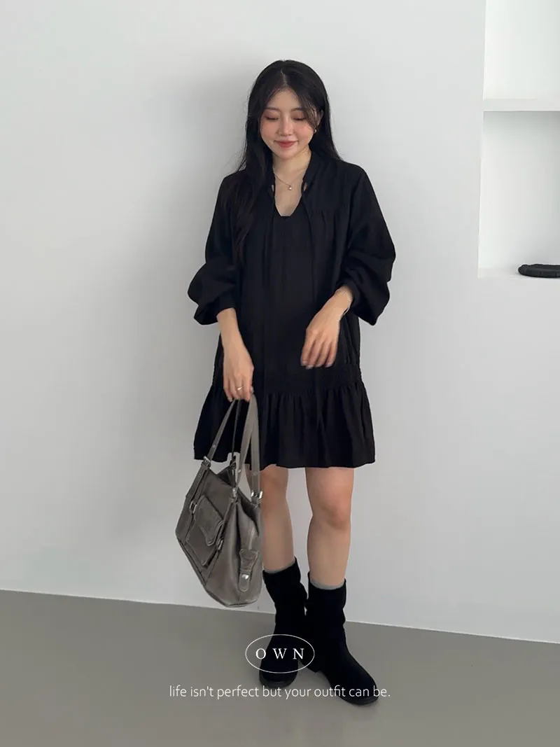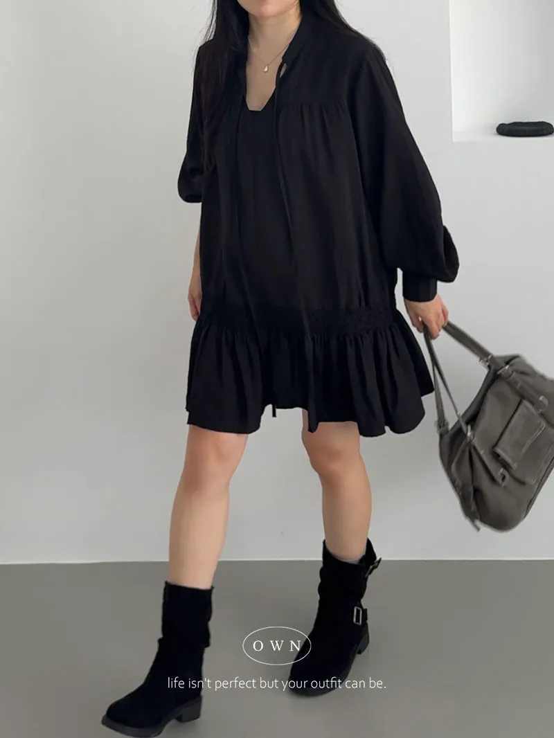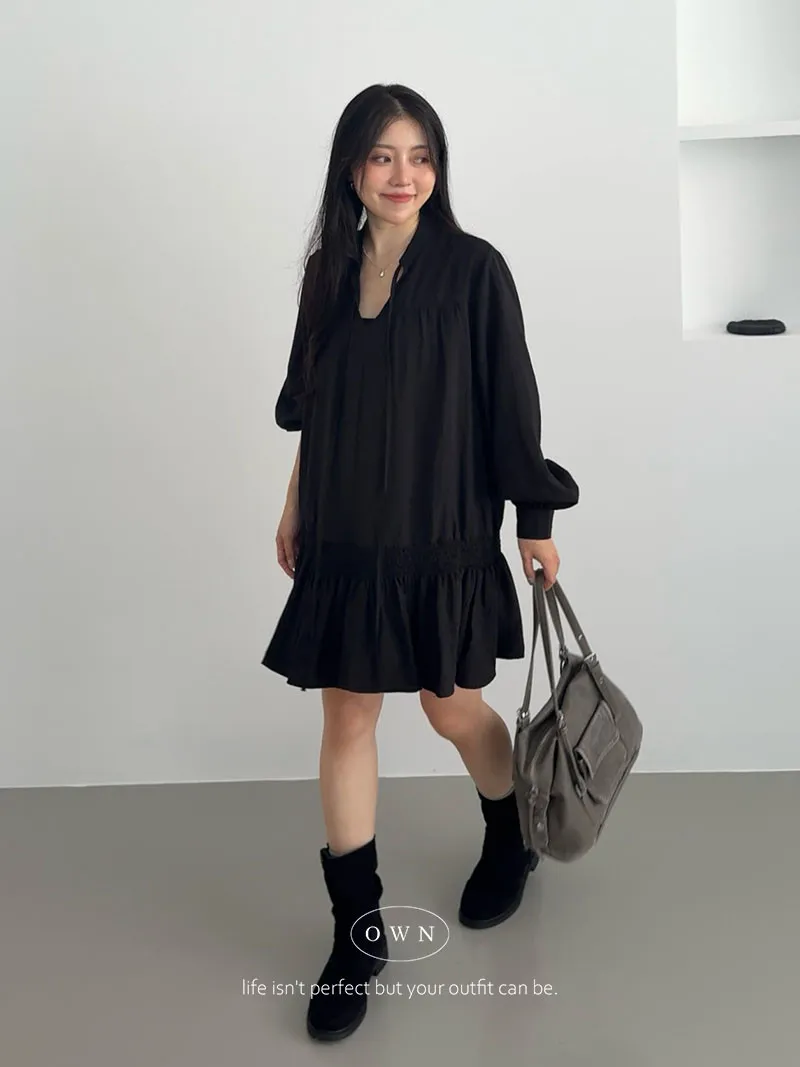 秋日氛圍感 綁帶小立領澎袖洋裝 2colors