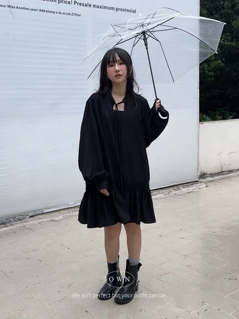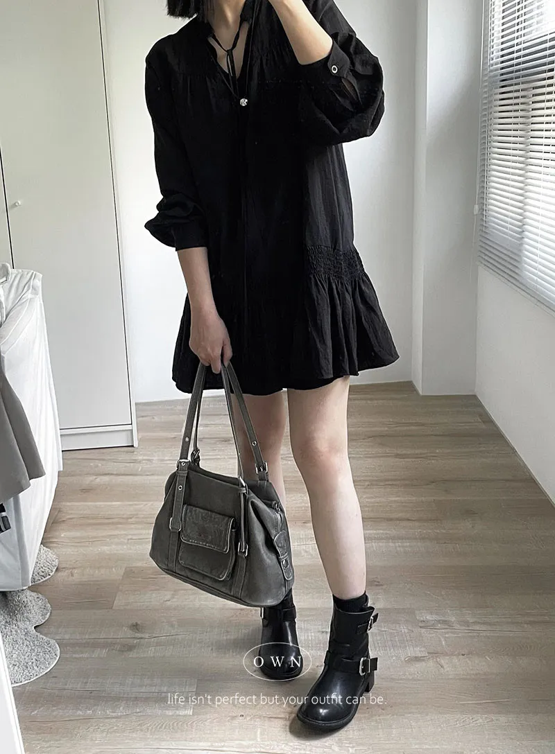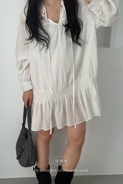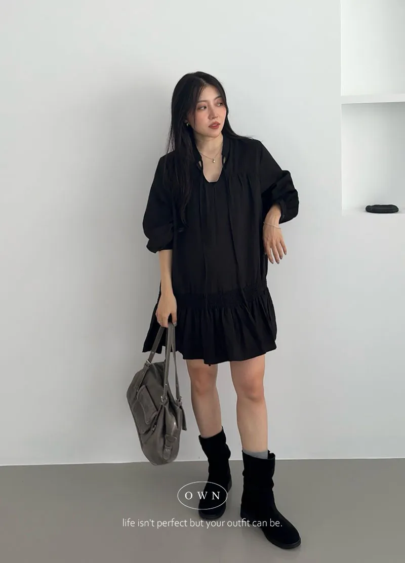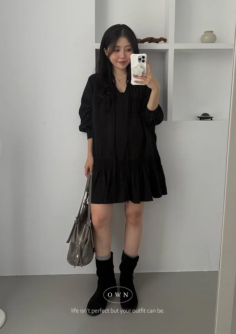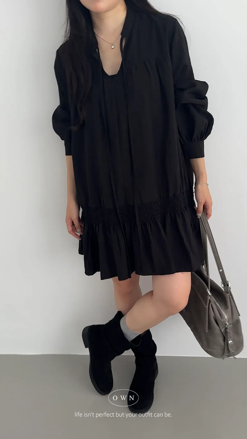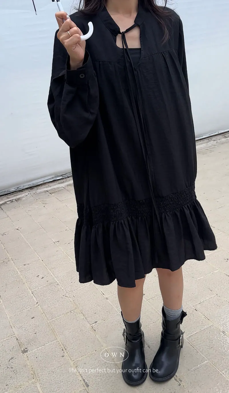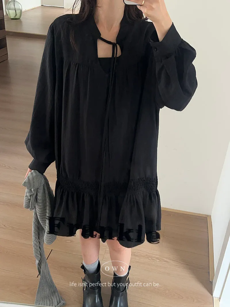 秋日氛圍感 綁帶小立領澎袖洋裝 2colors