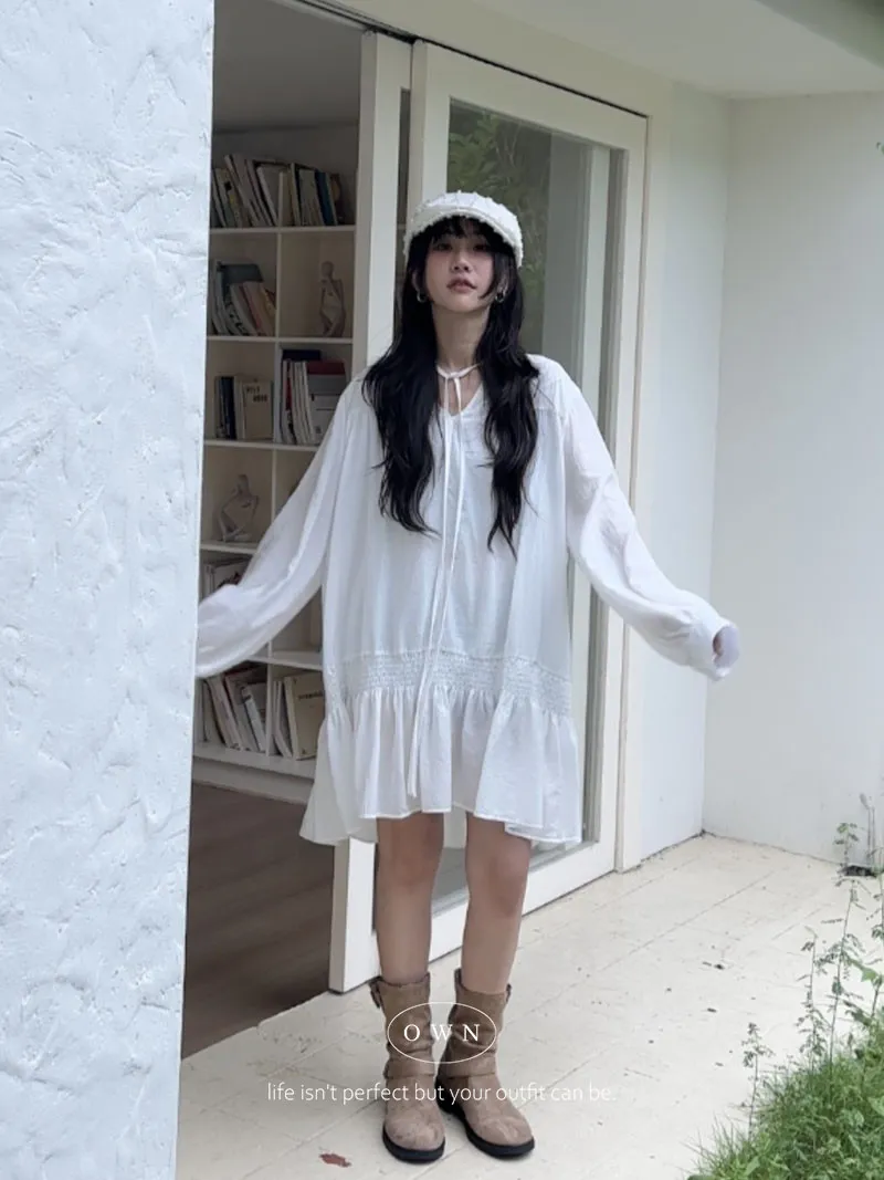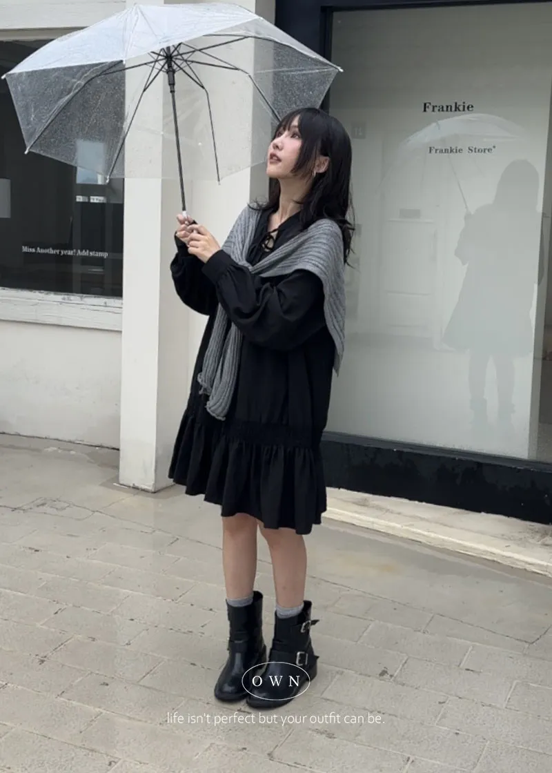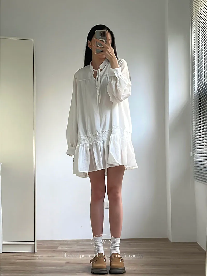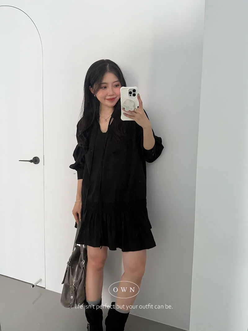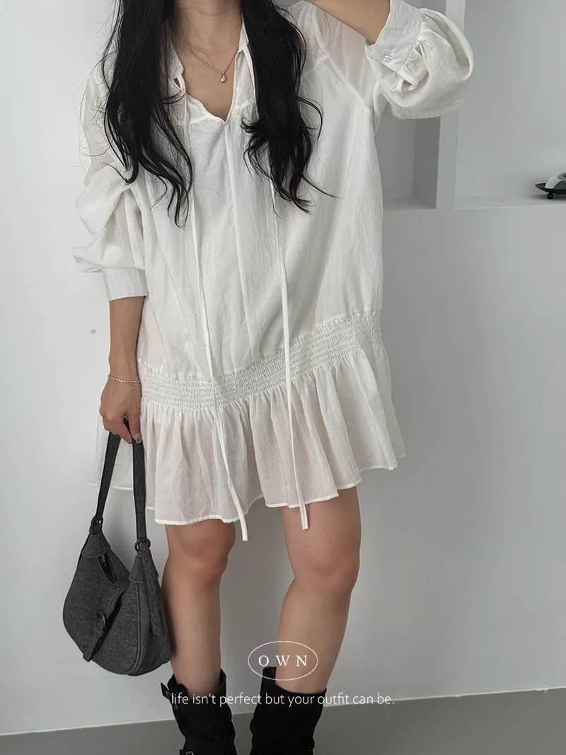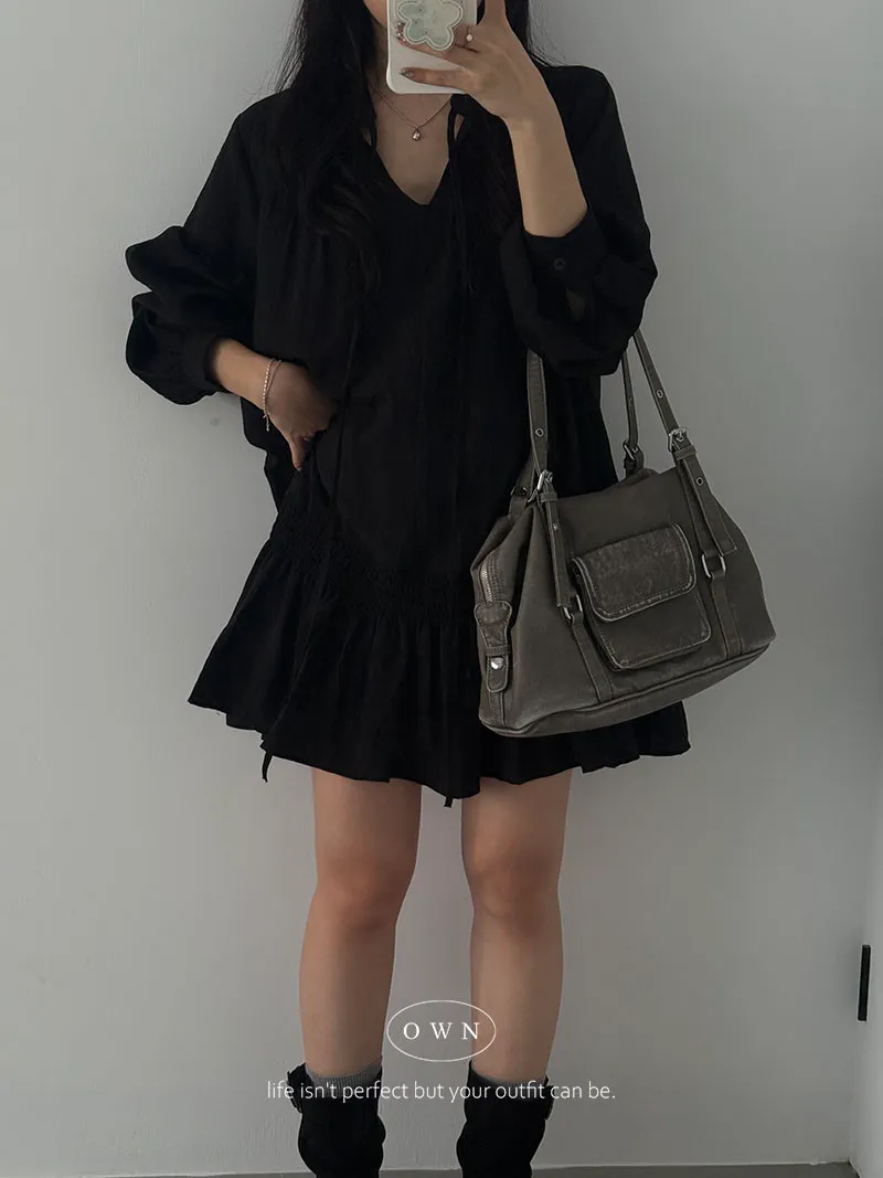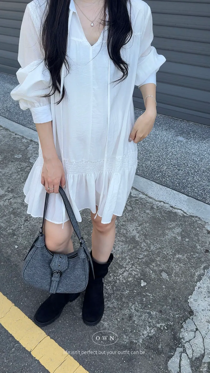 秋日氛圍感 綁帶小立領澎袖洋裝 2colors