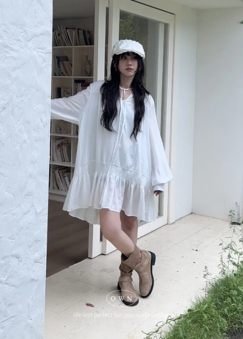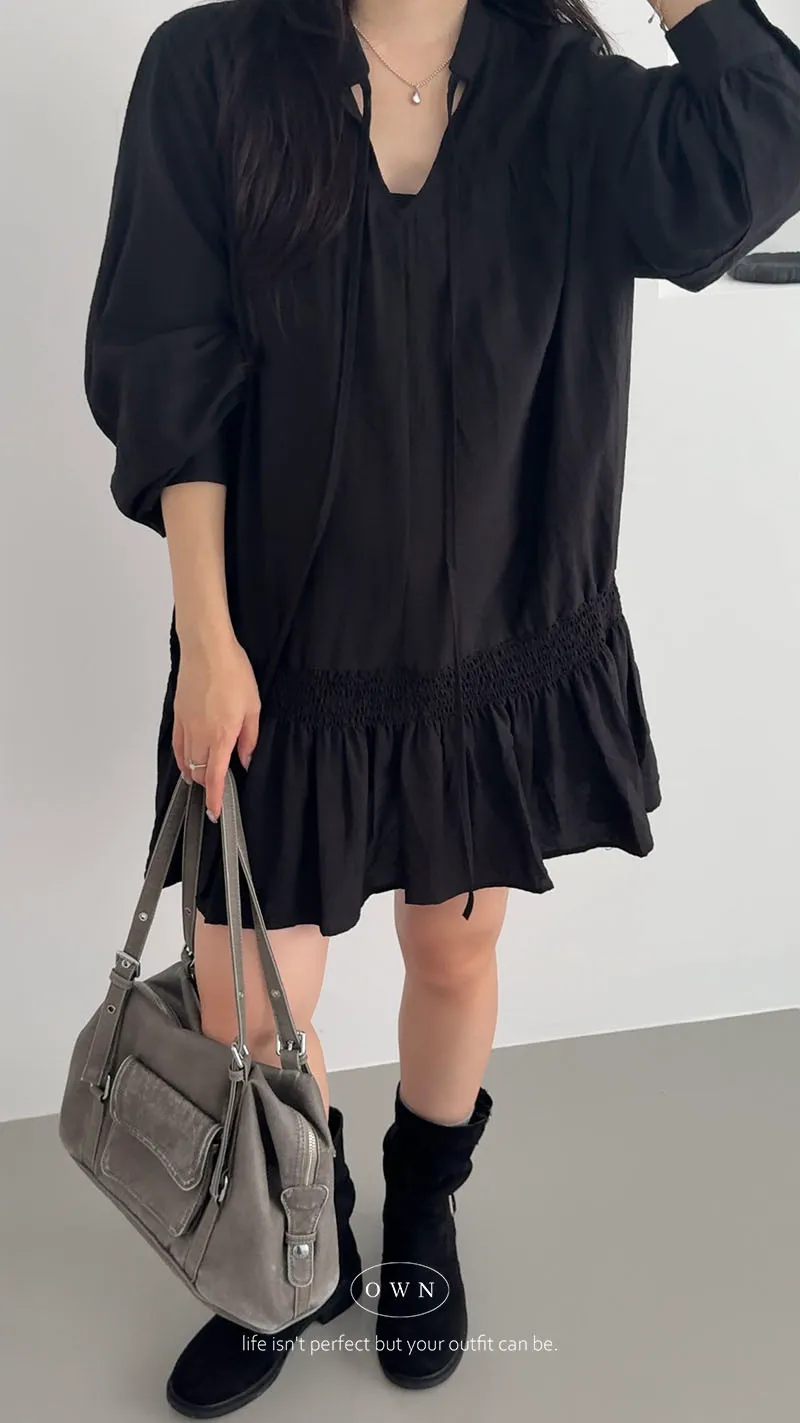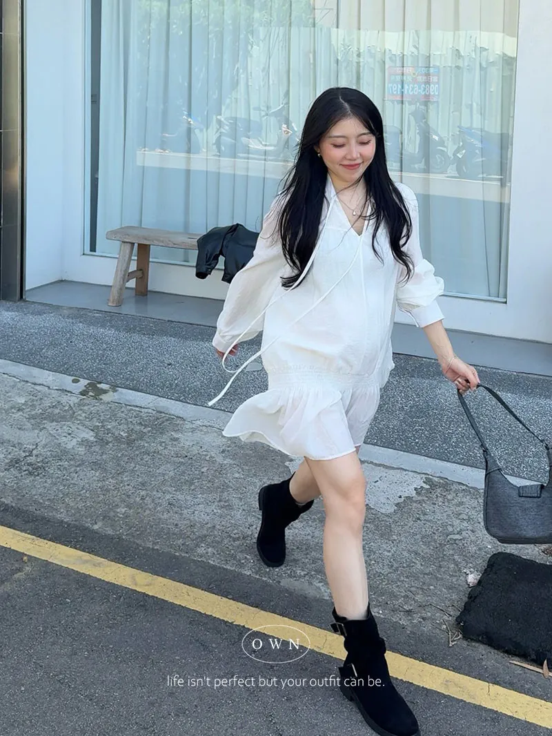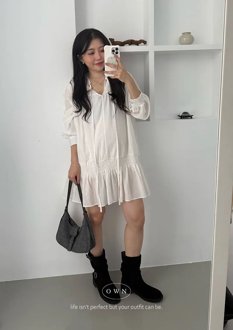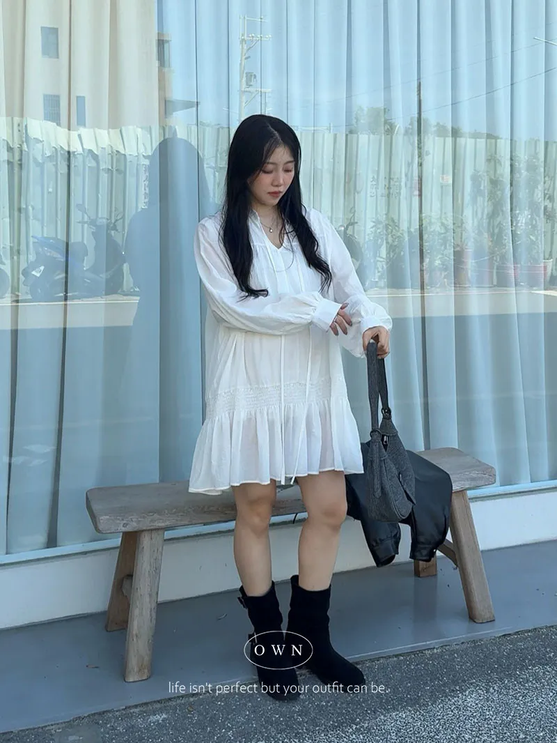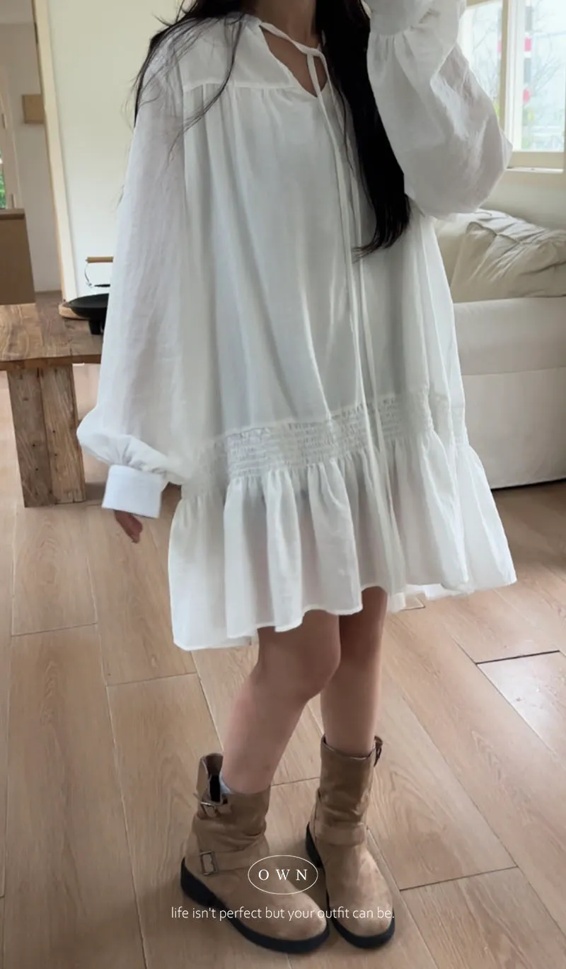 秋日氛圍感 綁帶小立領澎袖洋裝 2colors